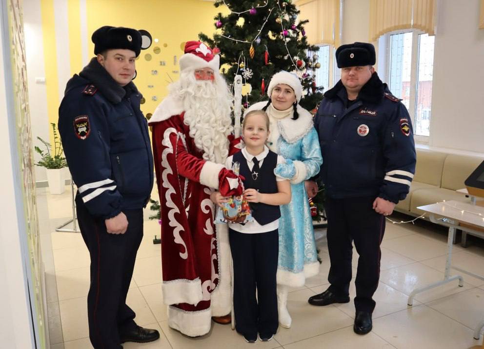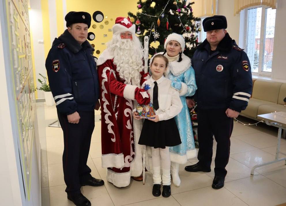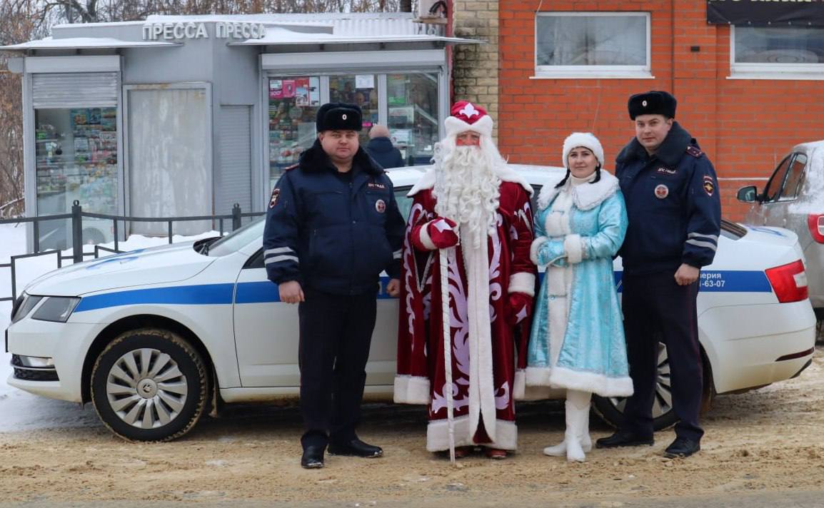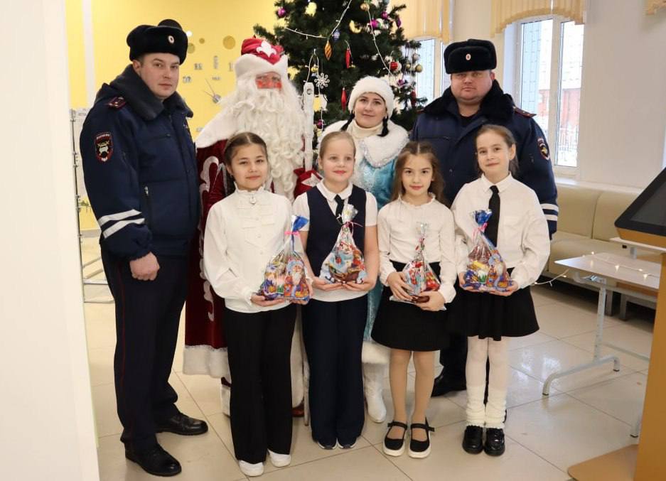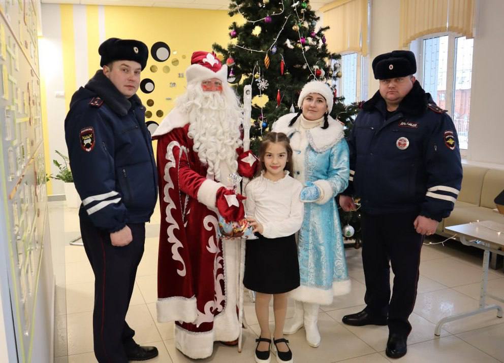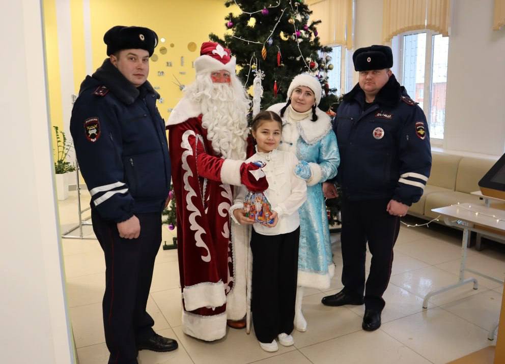 Детей ждал настоящий сюрприз: вместо строгих форменных курток — добрая улыбка Деда Мороза, а вместо инструктажа по ПДД — новогодние поздравления и тёплые пожелания здоровья, успехов в учёбе и, конечно же, безопасности на дорогах.