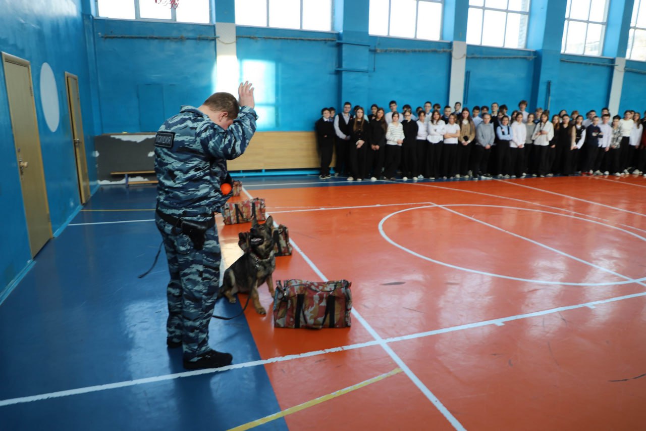 Специалисты Центра кинологической службы УМВД рассказали о процессе подготовки служебных собак и продемонстрировали тренировку по поиску взрывчатых веществ. Служебная собака Пума по команде полицейского быстро нашла имитатор запаха тротила, спрятанный в одной из выстроенных в ряд сумок, и под аплодисменты школьников получила за отличную заслуженную вкусняшку.