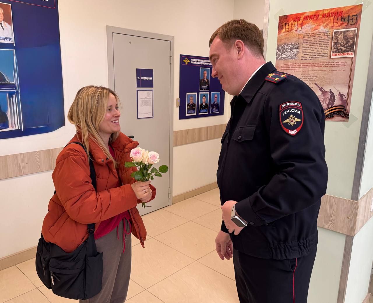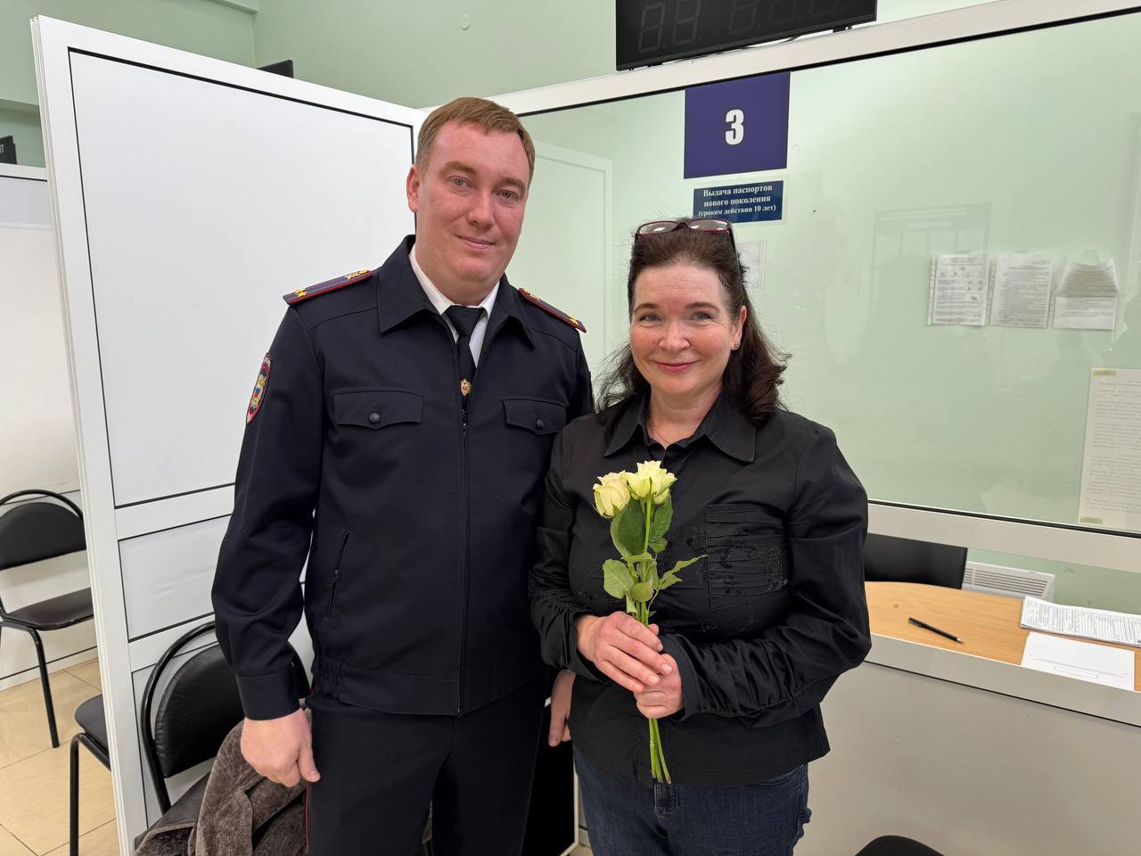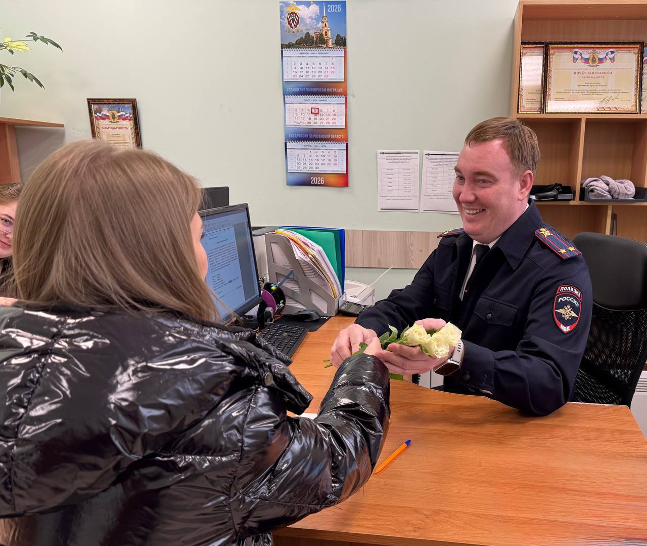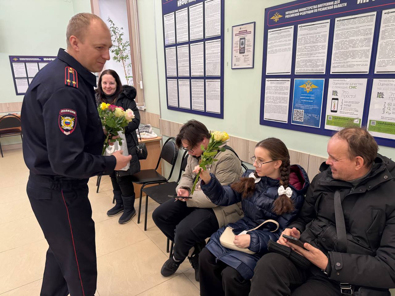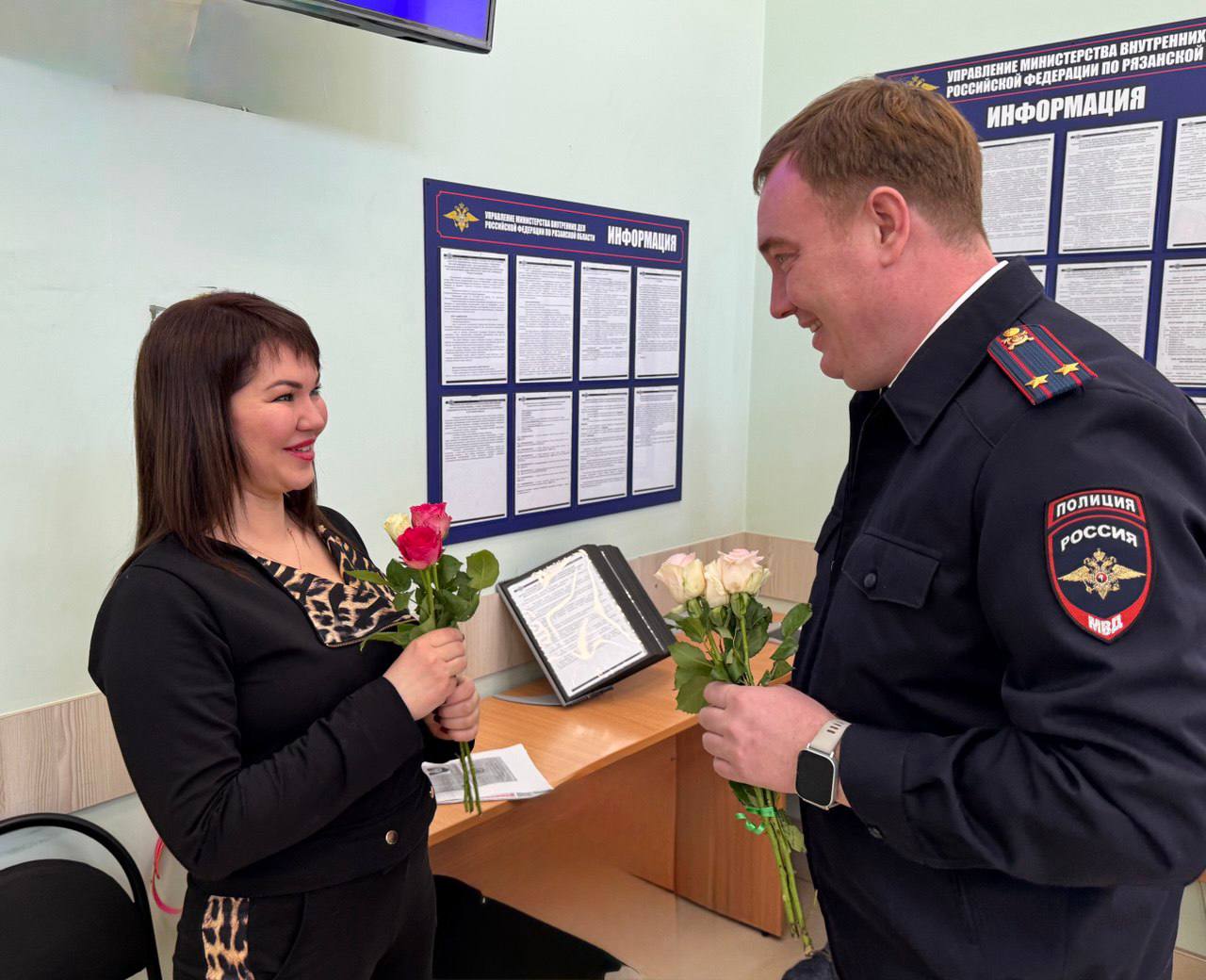 Начальник отдела иммиграционного контроля УВМ УМВД России по Рязанской области подполковник полиции Роман Стрельников и его заместитель подполковник полиции Сергей Муравьев вручили пришедшим получать загранпаспорт женщинам букеты весенних цветов.