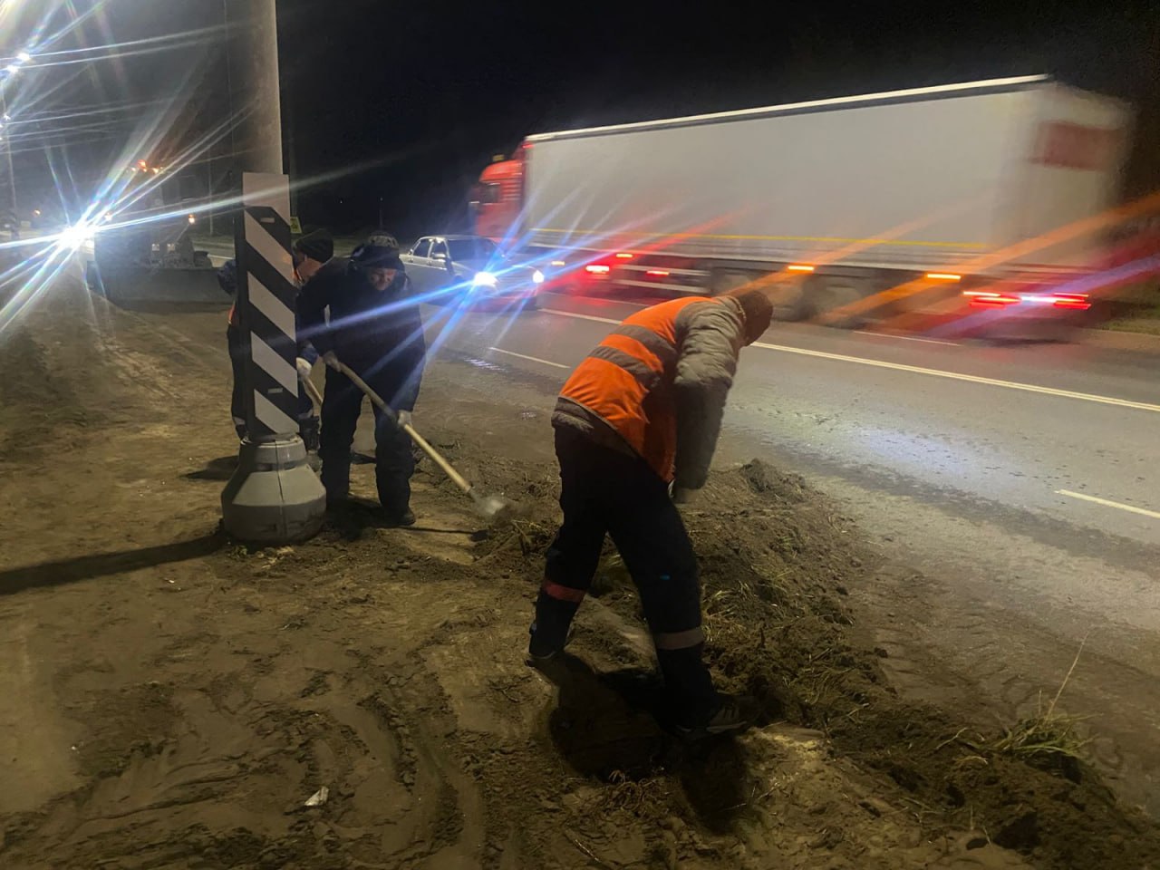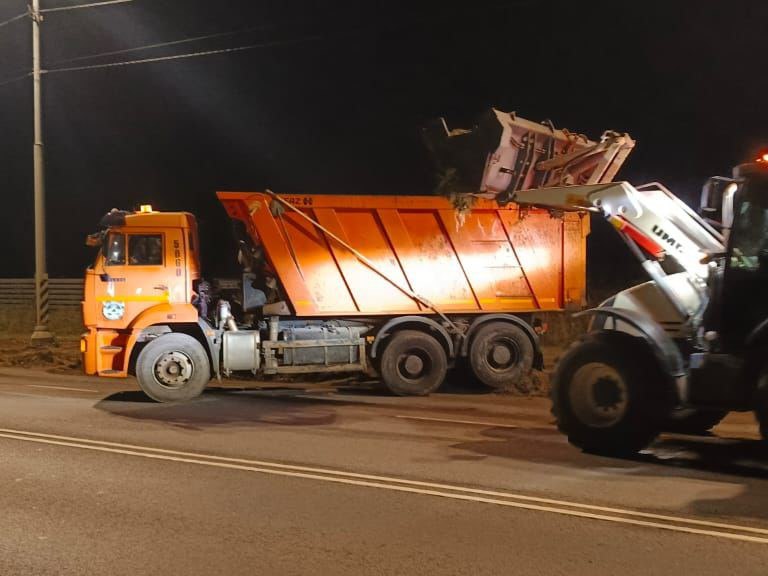 Днем уборка дорог и тротуаров продолжается. Также запланирован ямочный ремонт, работы по благоустройству территорий. Сотрудники собирают случайный мусор, очищают урны, проводят уборку остановок.