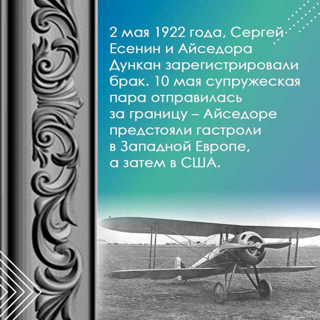2 мая 1922 года, Сергей Есенин и Айседора Дункан зарегистрировали брак. Супружеская пара отправилась за границу – Айседоре предстояли гастроли в Западной Европе, а затем в США. Они вылетелеи самым первым рейсом, который соединил советскую Россию с Германией.