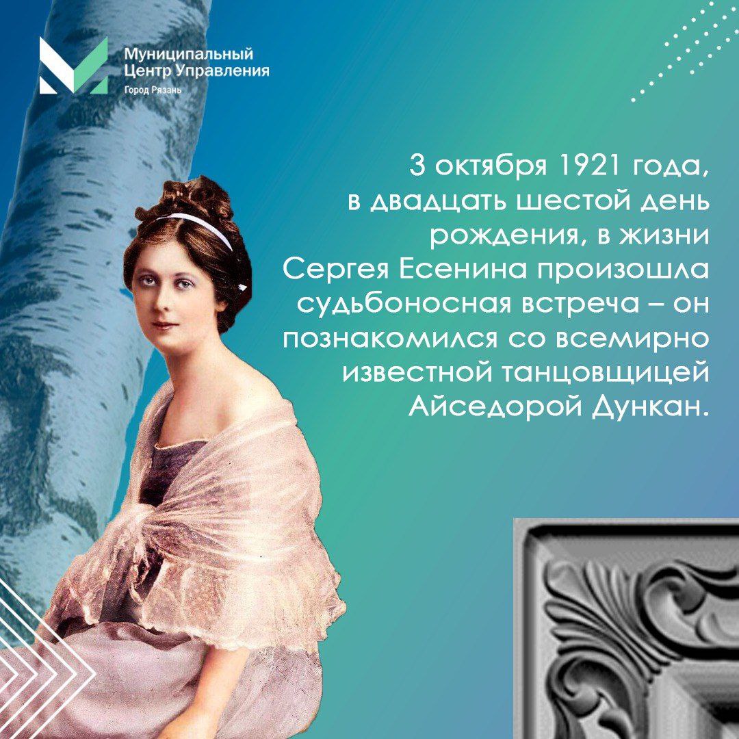 3 октября 1921 года, в 26 день рождения, в жизни Сергея Есенина произошла судьбоносная встреча – он познакомился с известной танцовщицей Айседорой Дункан.