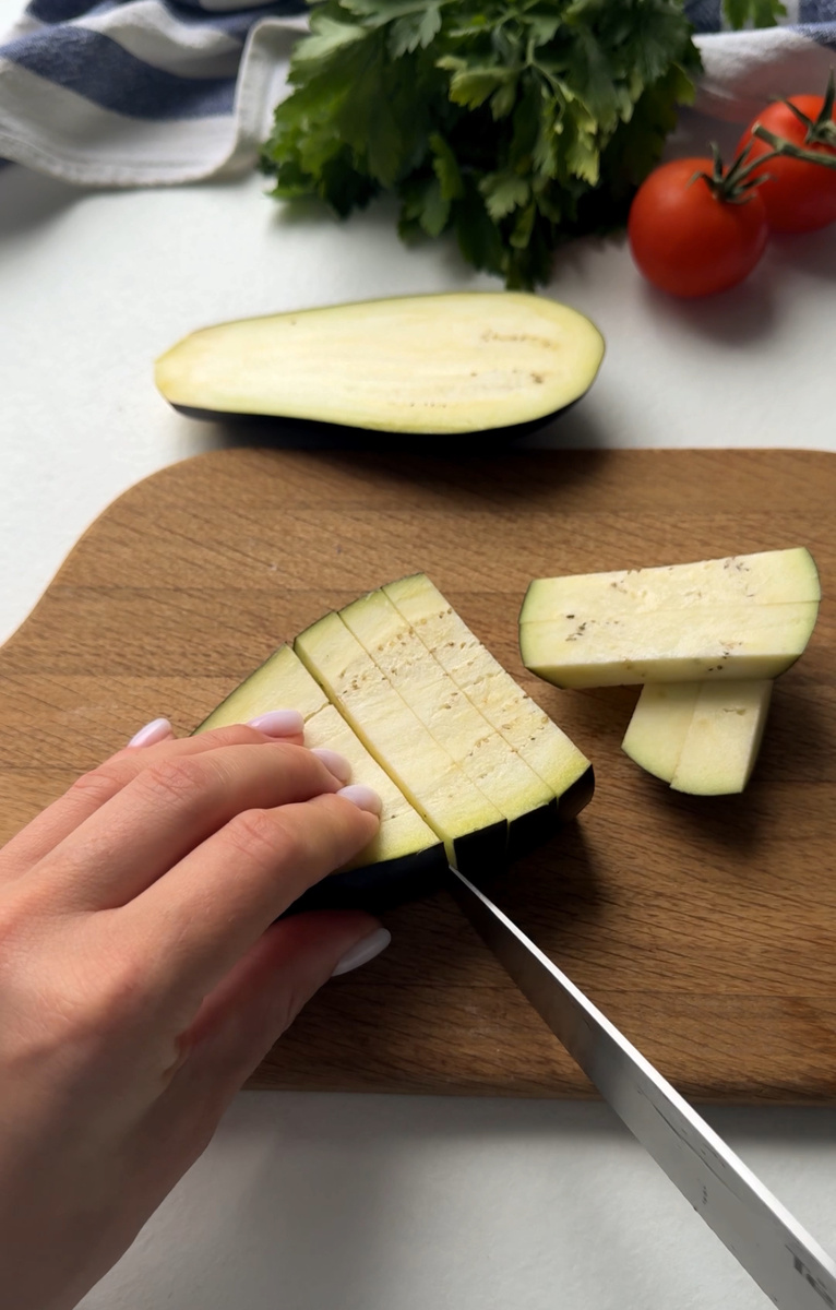 Первым шагом следует нарезать баклажан на тонкие ломтики, посыпать их солью и оставить на 5-7 минут. Это поможет удалить лишнюю влагу, после чего ломтики нужно хорошо промыть и просушить.