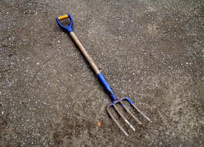 - Картофельные вилы — созданы для эффективной выемки корнеплодов. Зубья у них длинные (до 40 см) и слегка загнутые, что позволяет легко извлекать картошку из земли.