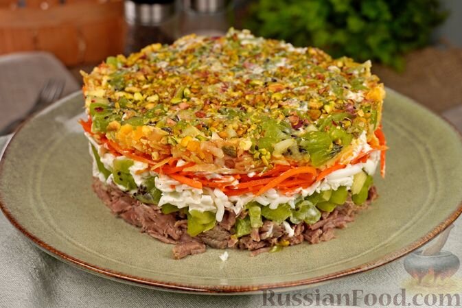 Этот салат порадует любителей необычных сочетаний. Говядина, яблоки и киви - ингредиенты, которые в сочетании создают фантастическую гармонию вкуса. Удивите своих гостей, подавая это оригинальное блюдо на праздничном столе!