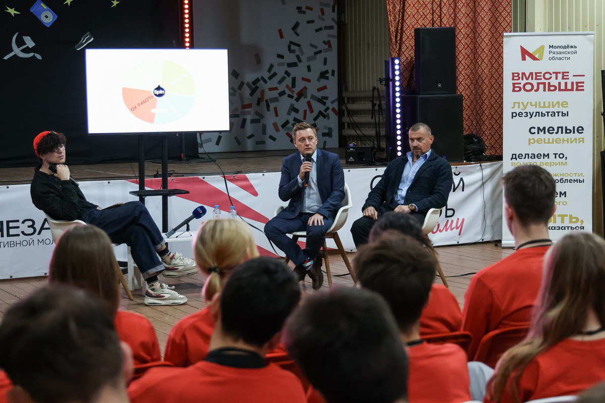 Первый зампред областного Правительства Денис Боков и участник регионального кадрового проекта «ГЕРОИ62», член Ассоциации ветеранов СВО, префект микрорайона Солотча Алексей Матасов провели встречу с участниками регионального лагеря актива студентов профессиональных образовательных организаций «Профессионал».