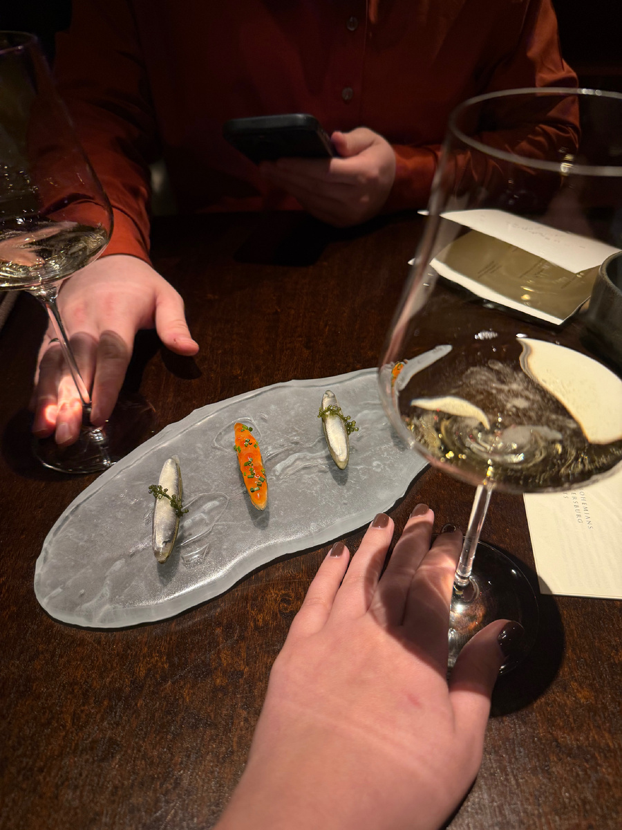 Сомелье Валерий Цирдава вел диалог через каждые поданные вина. Каждая бутылка была рассказом о том, как и почему она идеально сочетается с перекусами. Эта комбинация шефа, художника и сомелье создала уникальный гастрономический диалог, который оставил незабываемое впечатление.