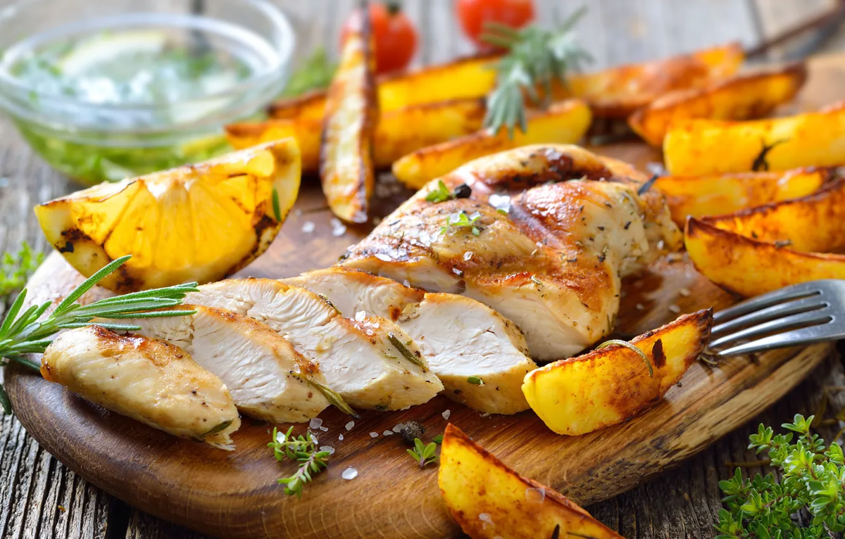 - Приготовление: Натрите курицу оливковым маслом, лимоном и чесноком, запекайте с картофелем при 200°C около 1 часа, поливая соком во время приготовления.