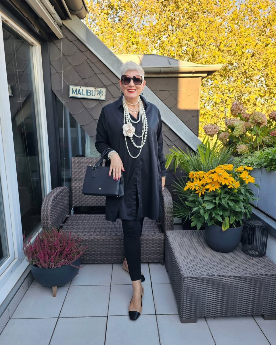 - Классика на каждый день: Черный шелковый комплект, состоящий из леггинсов и удлиненной рубашки, дополнен бежевыми туфлями на плоской подошве. Этот образ излучает элегантность и завершенность, особенно с крупными солнцезащитными очками и многослойным жемчужным украшением.