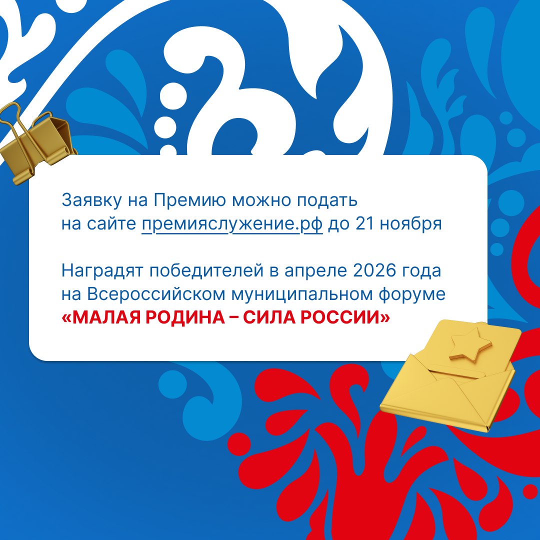 Участвовать могут главы муниципальных образований, депутаты, сотрудники советов МО, председатели ТОС и сельские старосты. Прием заявок уже стартовал на сайте: премияслужение.рф. Подробнее об этом — в наших карточках.