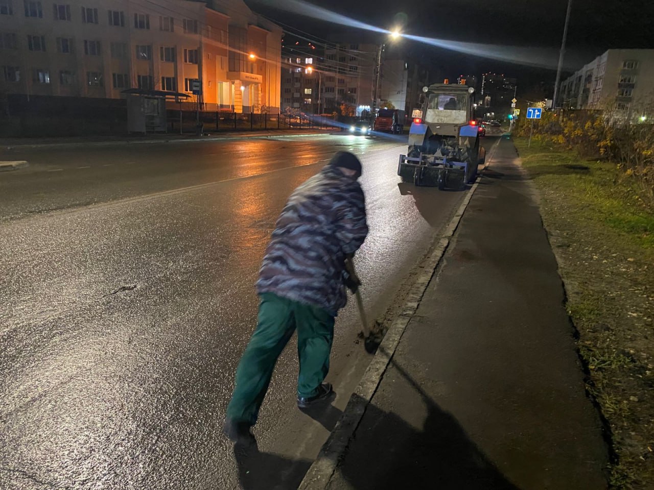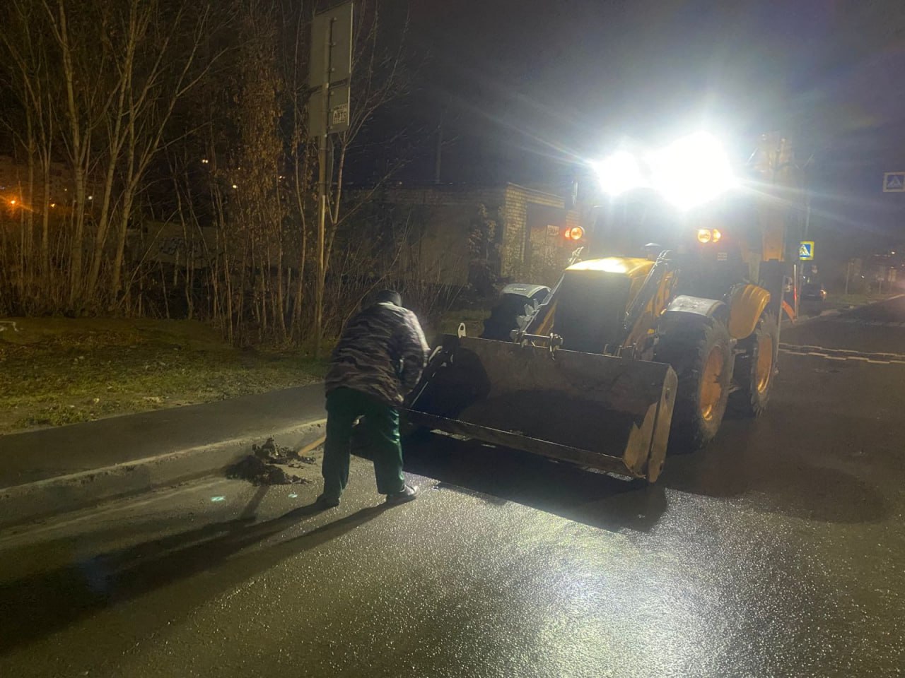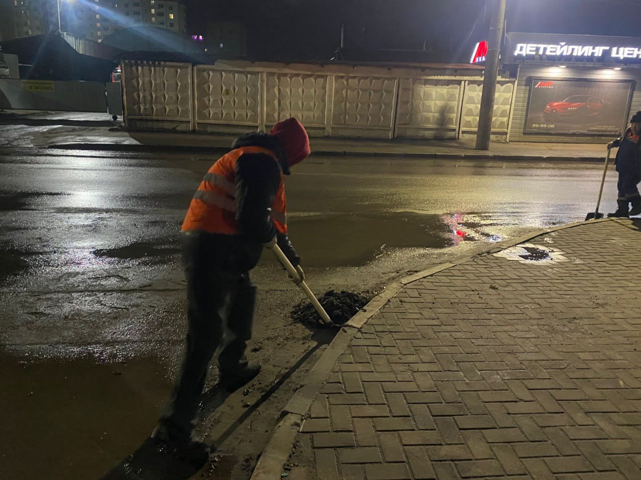 Днем уборка продолжается. Проводятся работы по уборке и благоустройству, спецтехника подметает дороги и тротуары. Запланирован ямочный ремонт.
