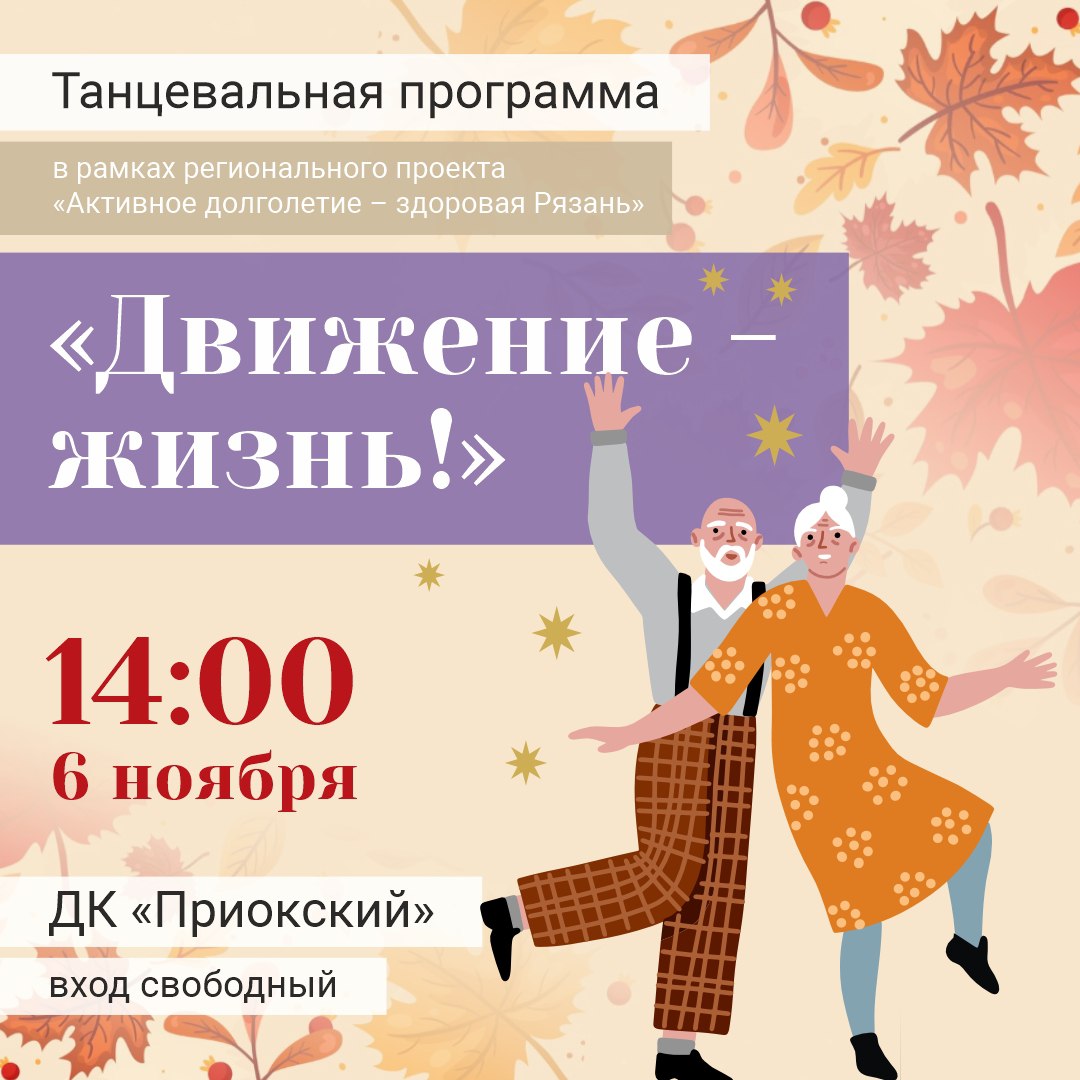 6 ноября в 14:00 рязанцев приглашают принять участие в танцевальной программе в рамках регионального проекта «Активное долголетие – здоровая Рязань». Мероприятие состоится в ДК «Приокский».