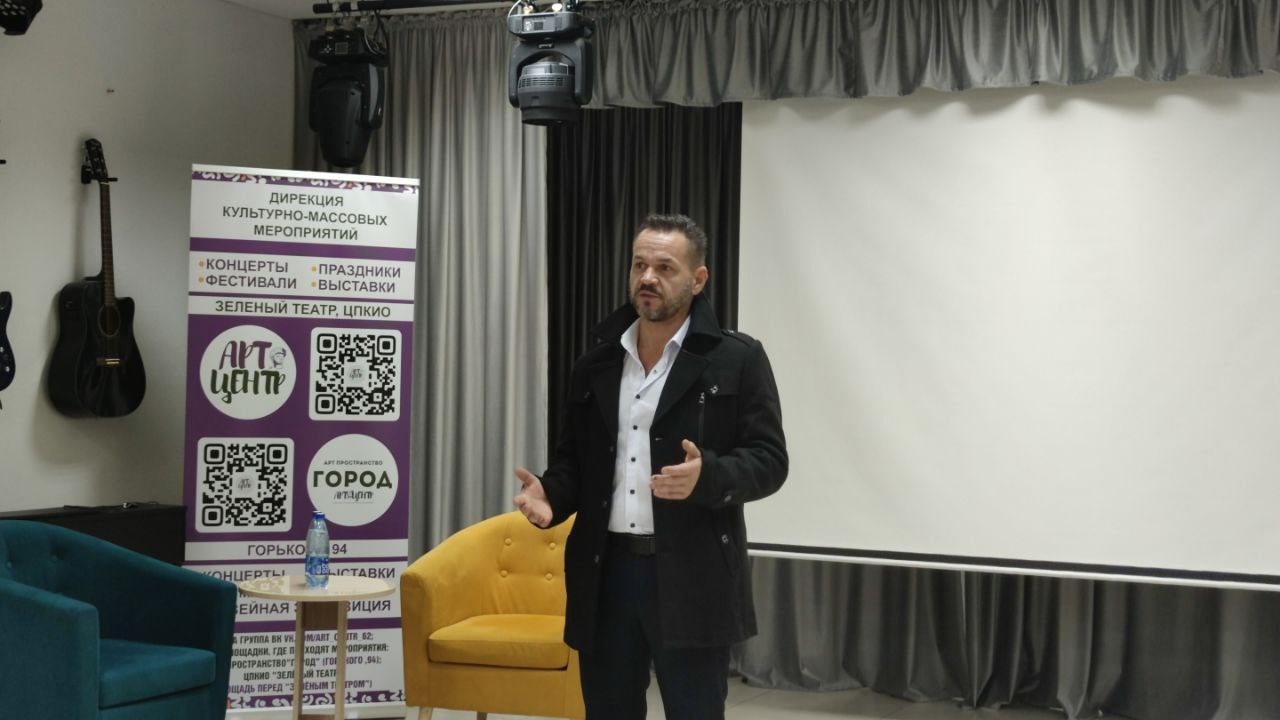 Перед собравшимися выступил режиссер фильма Сергей Гарусов. Он рассказал о том, как возникла идея снять цикл кино и как проходили съемки картины про Андрея Лапина.