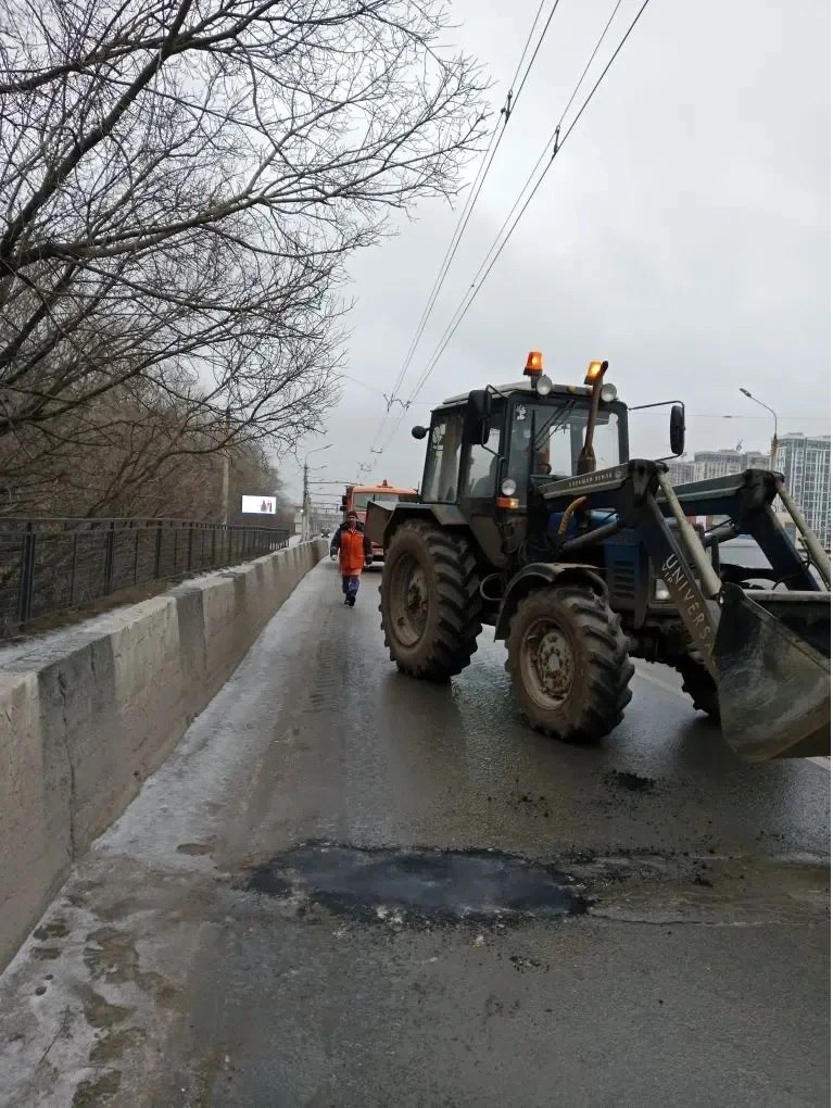 Спецтехника ДБГ после выпадения осадков вышла на обработку дорог общего пользования. В ночное время на дежурстве будут находиться «Чистики» и КДМ.