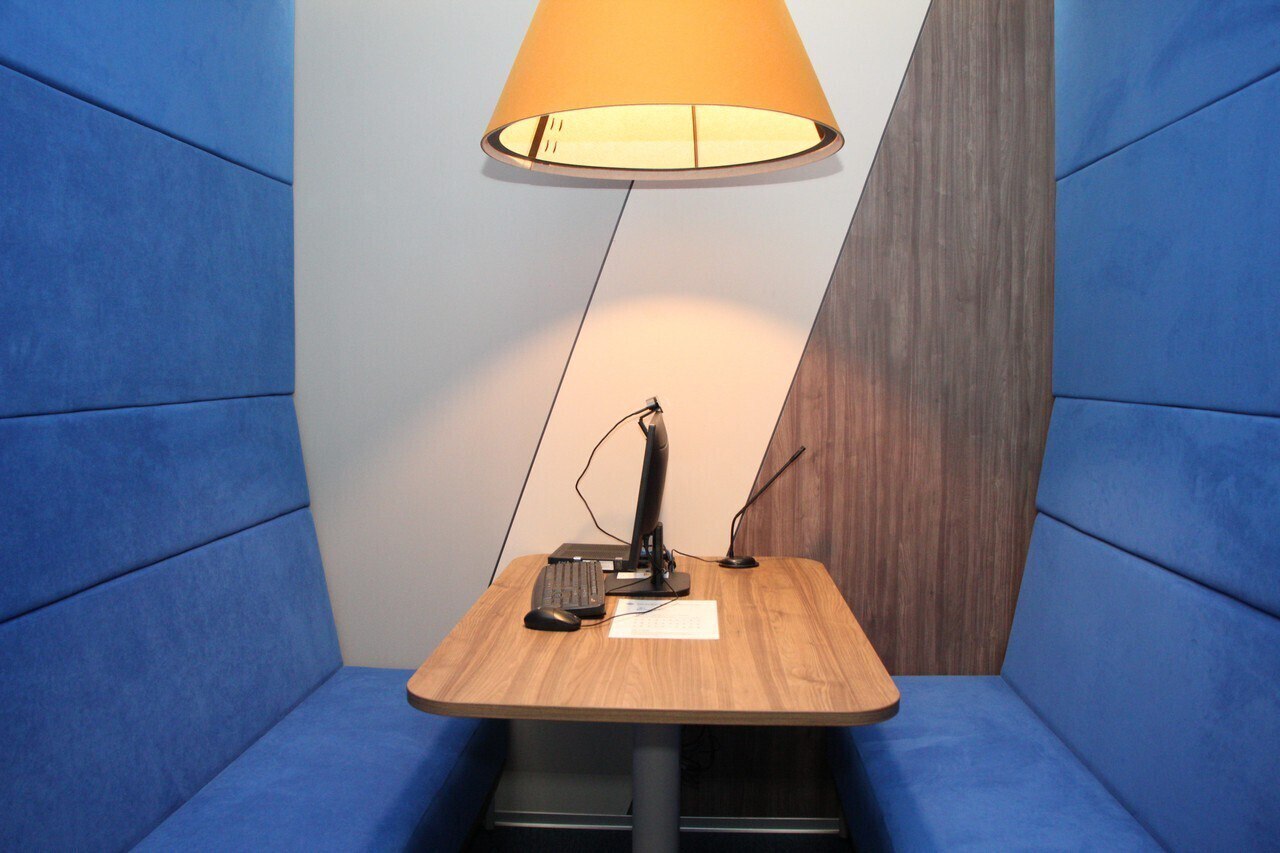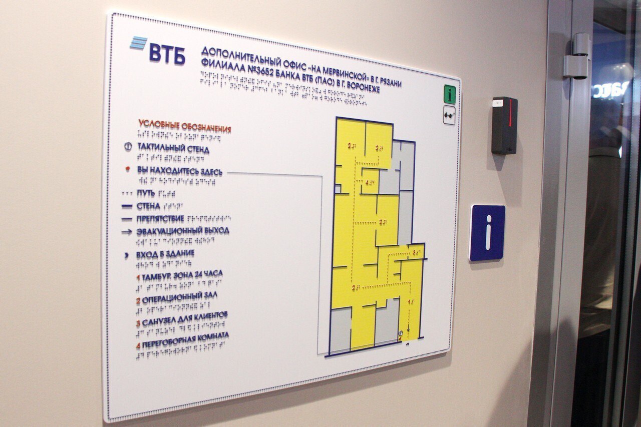 Пространство офиса, площадью 222 кв.и. организовано по принципу open space: здесь нет традиционных стоек и перегородок. У каждого сотрудника отдельный стол, а для общения есть мягкие диваны и кресла. Есть также закрытые зоны для приветных переговоров. Офис адаптирован для маломобильных клиентов: установлен пандус, а банкоматы и таблички навигации имеют элементы для слабовидящих.