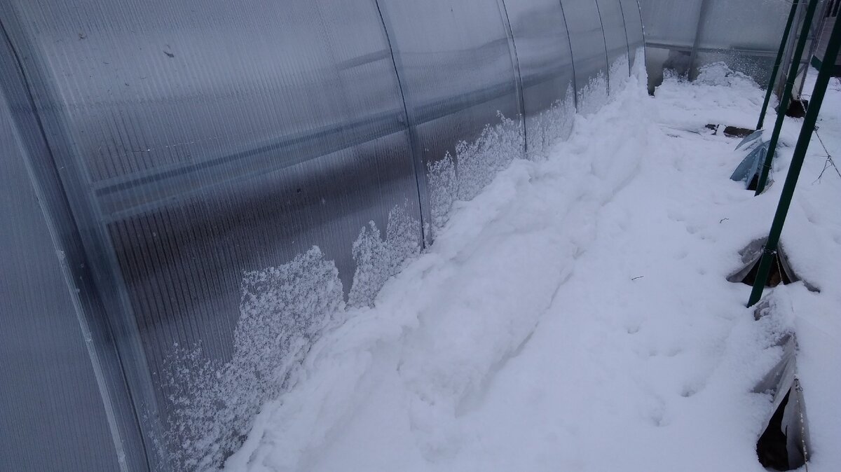 Внутри таких теплиц замечено, что рыхлый снег с острой крыши, как правило, спокойно скатывается вниз. Однако с приходом дождливых морозов мокрый снег может образовывать корку льда, что увеличивает нагрузку на конструкцию. Кроме того, даже при сухом снеге под солнечными лучами зрительно появляется наледь на поликарбонате.