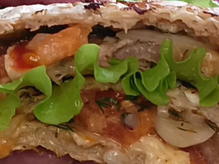 На среднем огне обжаривать лаваш около 5 минут до золотистой корочки. Тем временем, для соуса не понадобится сложных манипуляций — просто смешайте кетчуп с майонезом. После обжарки лаваш аккуратно переворачивается, смазывается соусом, после чего на одну половину выкладываются маринованные огурцы, лук и помидоры. Завершающим аккордом станет тертый сыр, который добавит сливочный вкус.