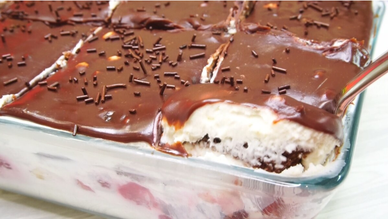 Подготовьте начинку, нарезая клубнику и бананы. Для сборки десерта используйте прямоугольную форму. Начните с крема на дне, затем уложите кусочки бисквита и крем, продолжая слоями с ягодами. Завершите оставшимся кремом и уберите в холодильник на час, чтобы десерт настоялся.