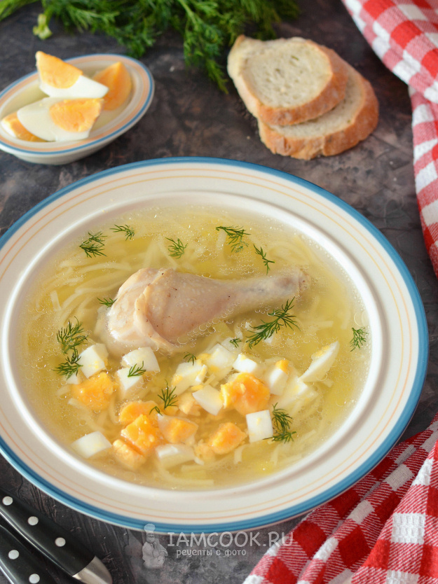 Разлейте суп по тарелкам, добавьте немного куриного мяса и нарезанное яйцо. Для украшения можете использовать зелень, например, петрушку или укроп, но и без этого суп будет вкусным и ароматным.