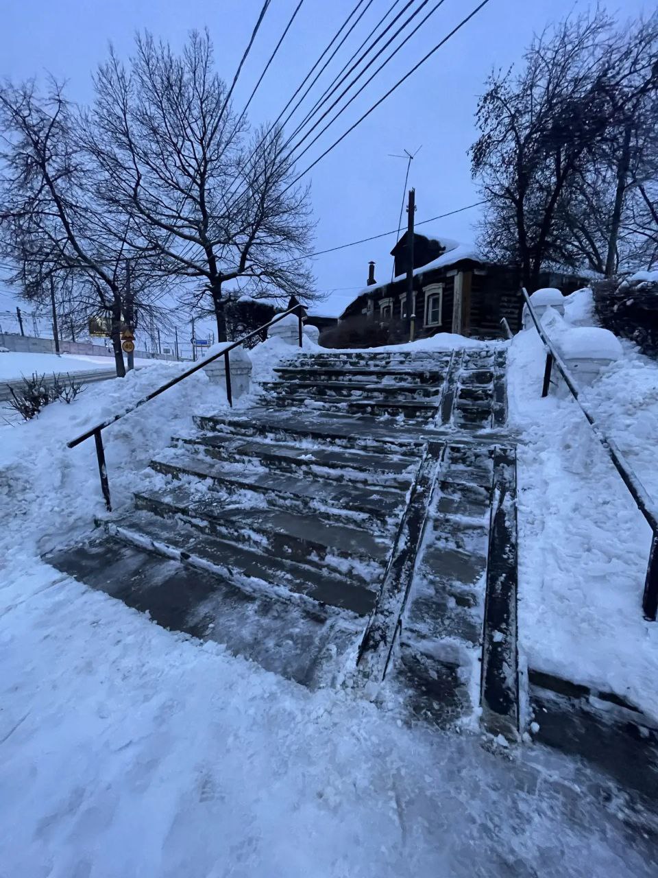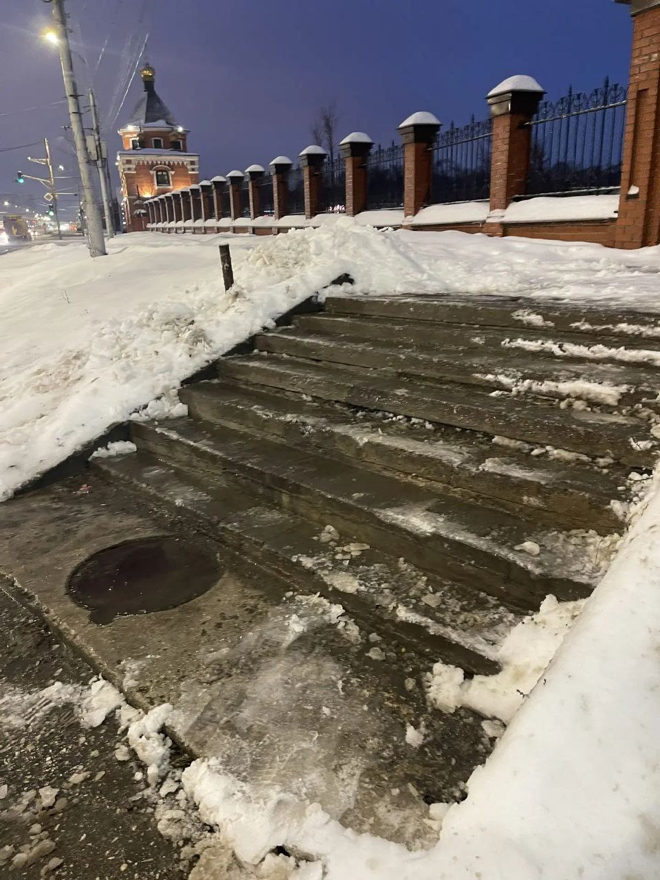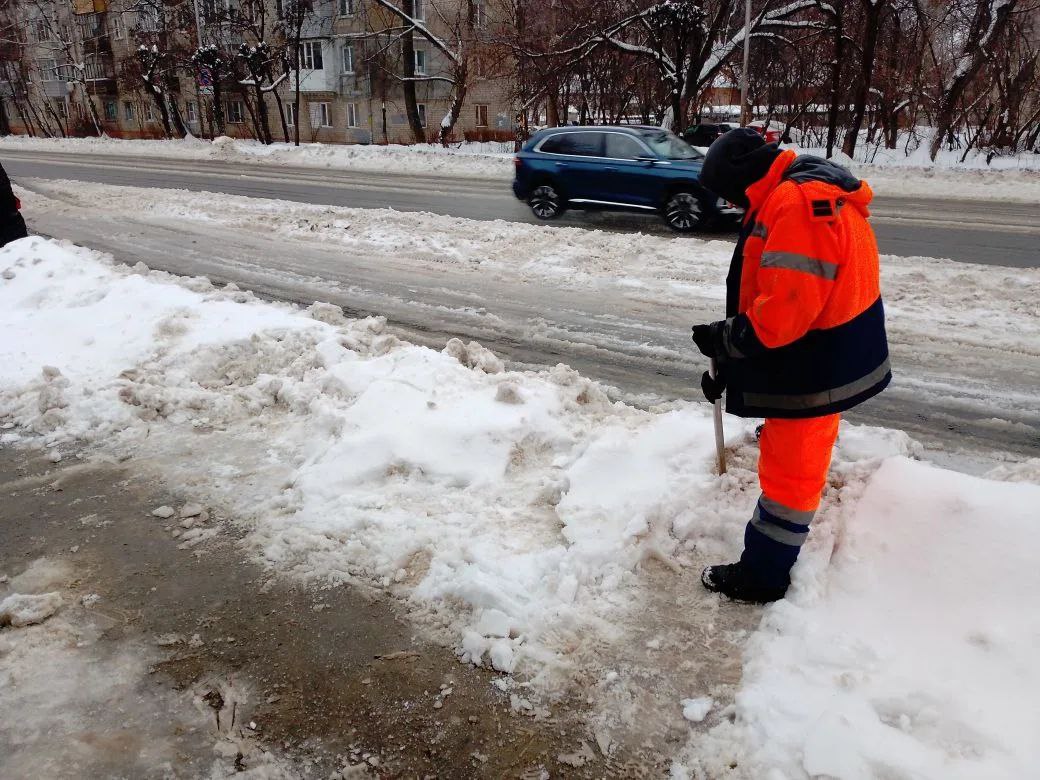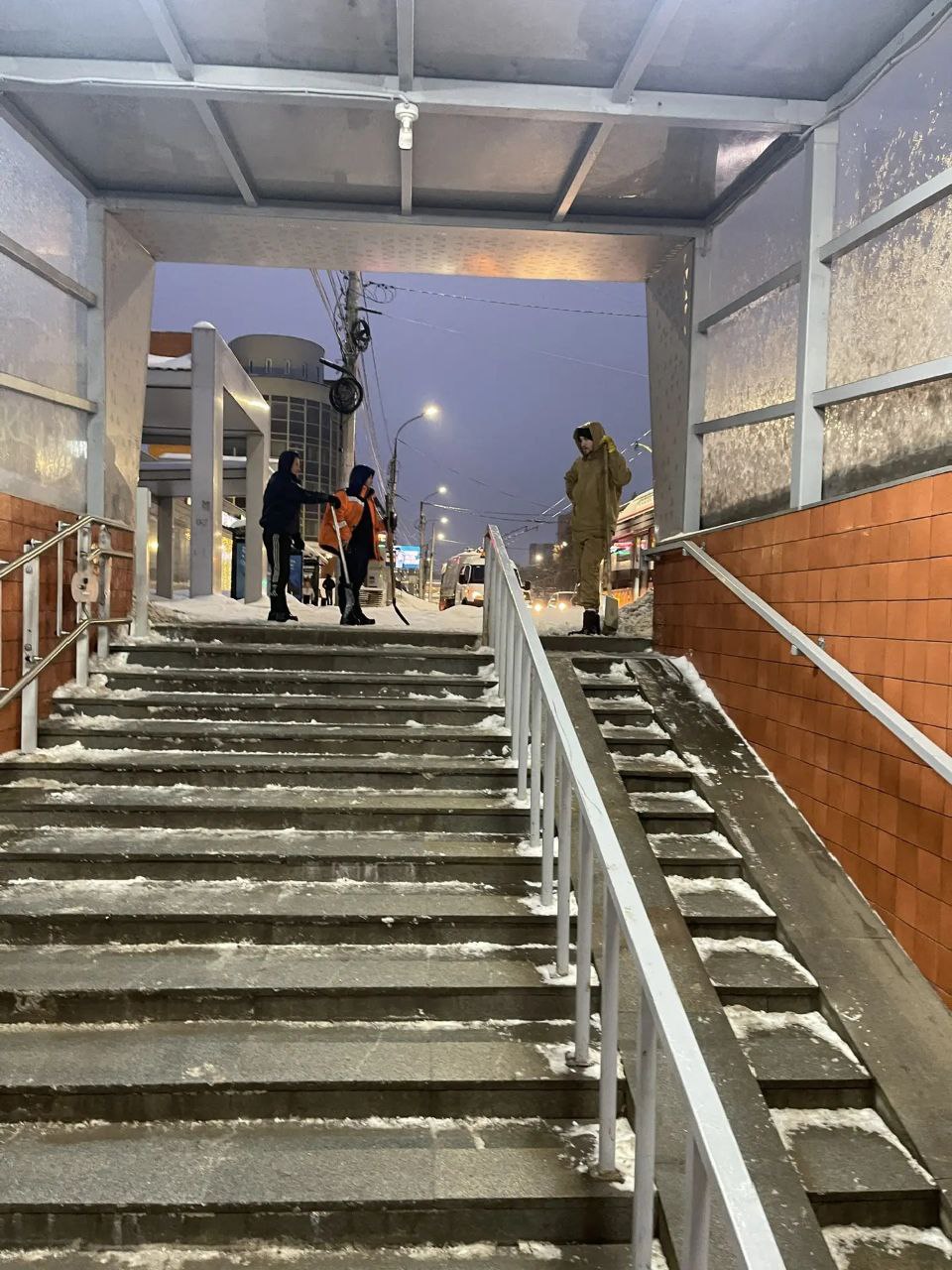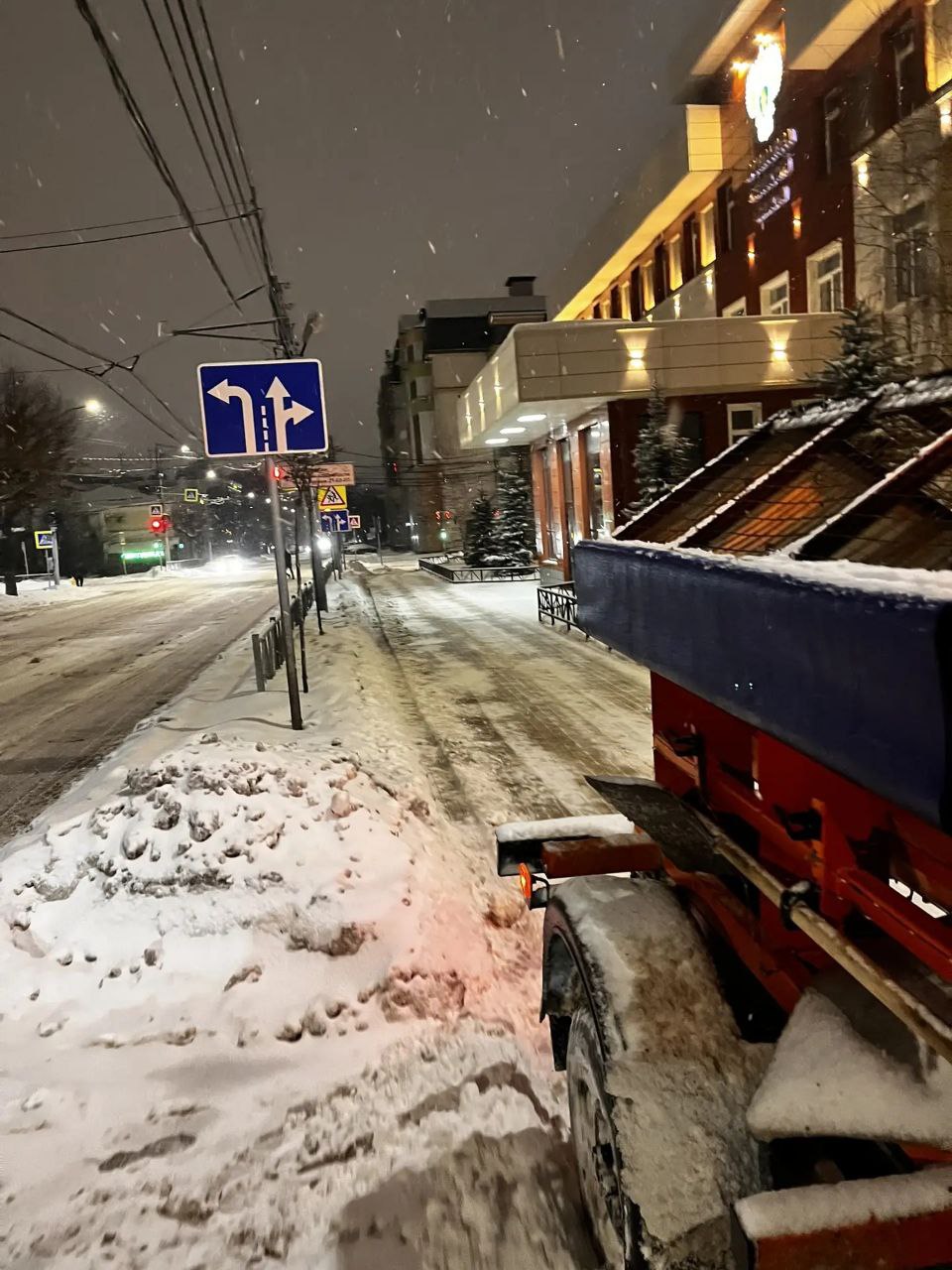 Днем подрядчики расчищают дороги, в город утром вышли 20 комбинированных машин и «Чистики» ДБГ. Сотрудники работают на остановках, лестницах, пешеходных переходах. отдельная бригада обслуживает ливневую канализацию.