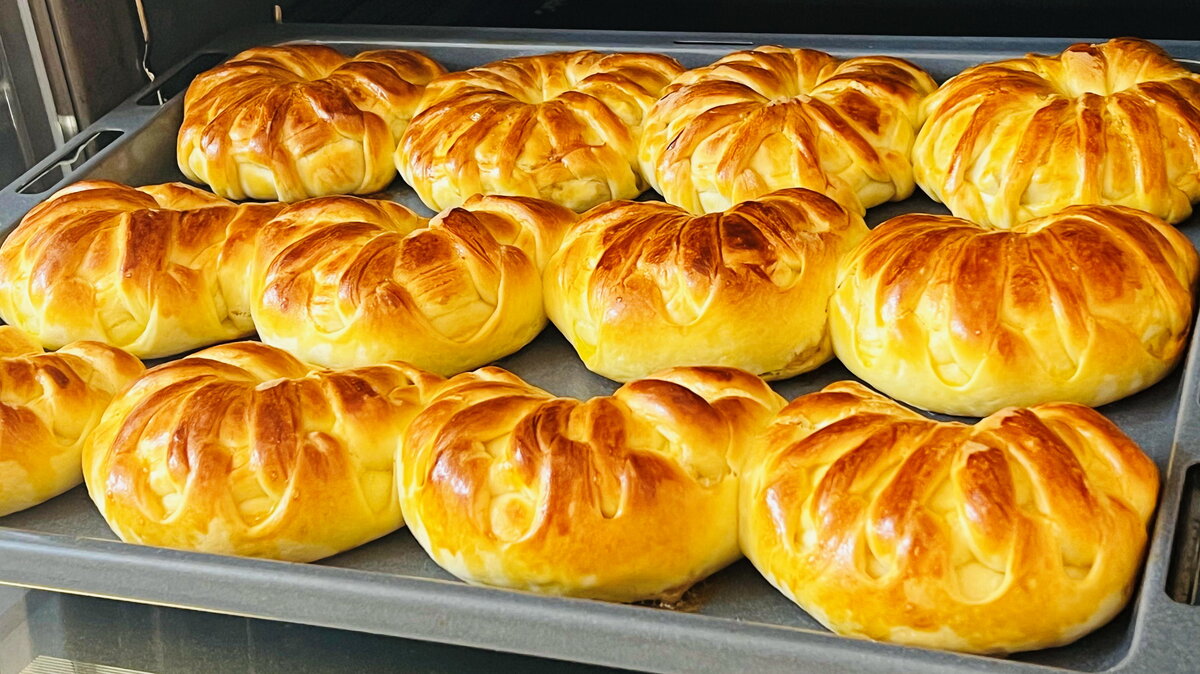 Когда тесто готово, разделите его на 12 частей и раскатайте каждая в круглый пласт. На одну половину положите начинку, затем накройте другой половиной теста, оставляя небольшое пространство. Сделайте надрезы на верхней части теста, чтобы оформить плетёнку — это придаст булочкам оригинальный вид. Соедините края и выложите заготовки на противень, предварительно смазанный растительным маслом.