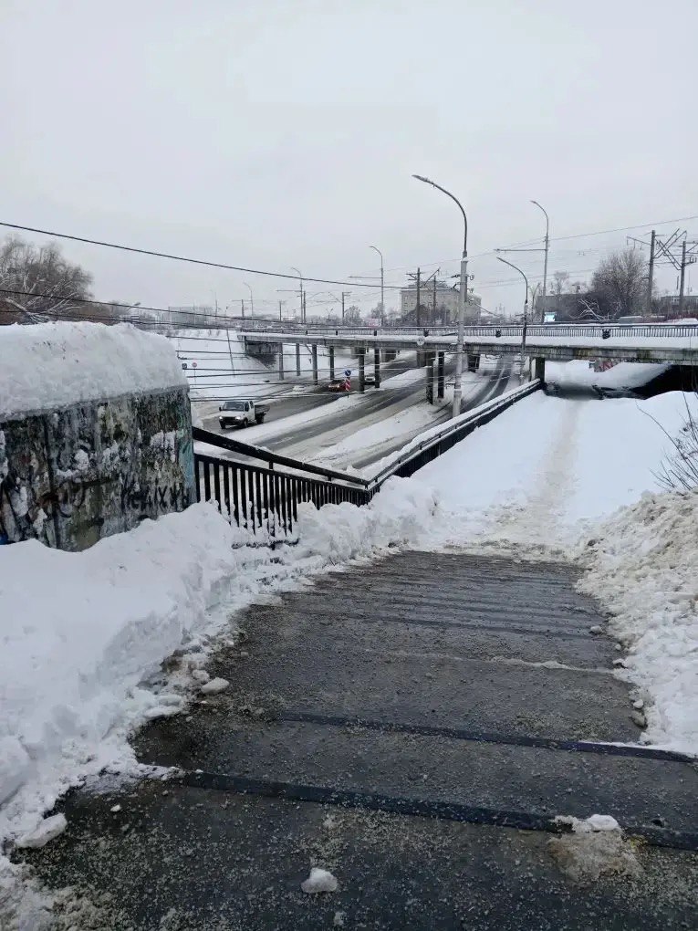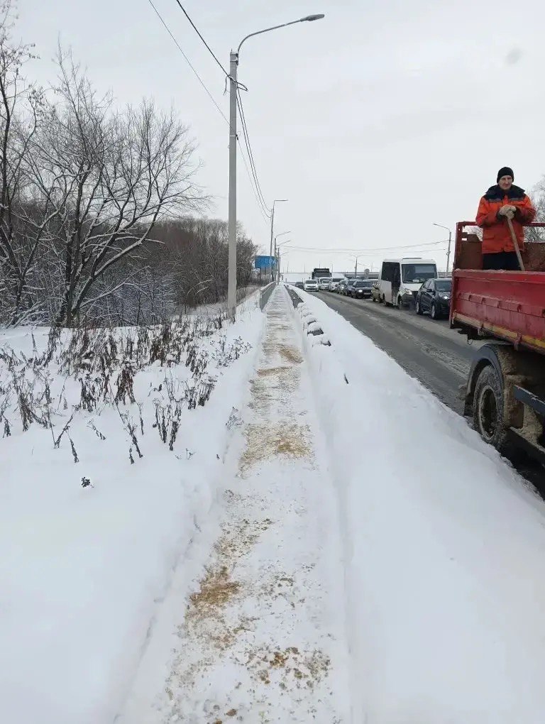 Рабочие чистили пешеходные зоны Куйбышевского путепровода, моста через Трубеж на Московском шоссе, Горбатом мосту, Брессюирском мосту, путепроводе на улице Есенина.