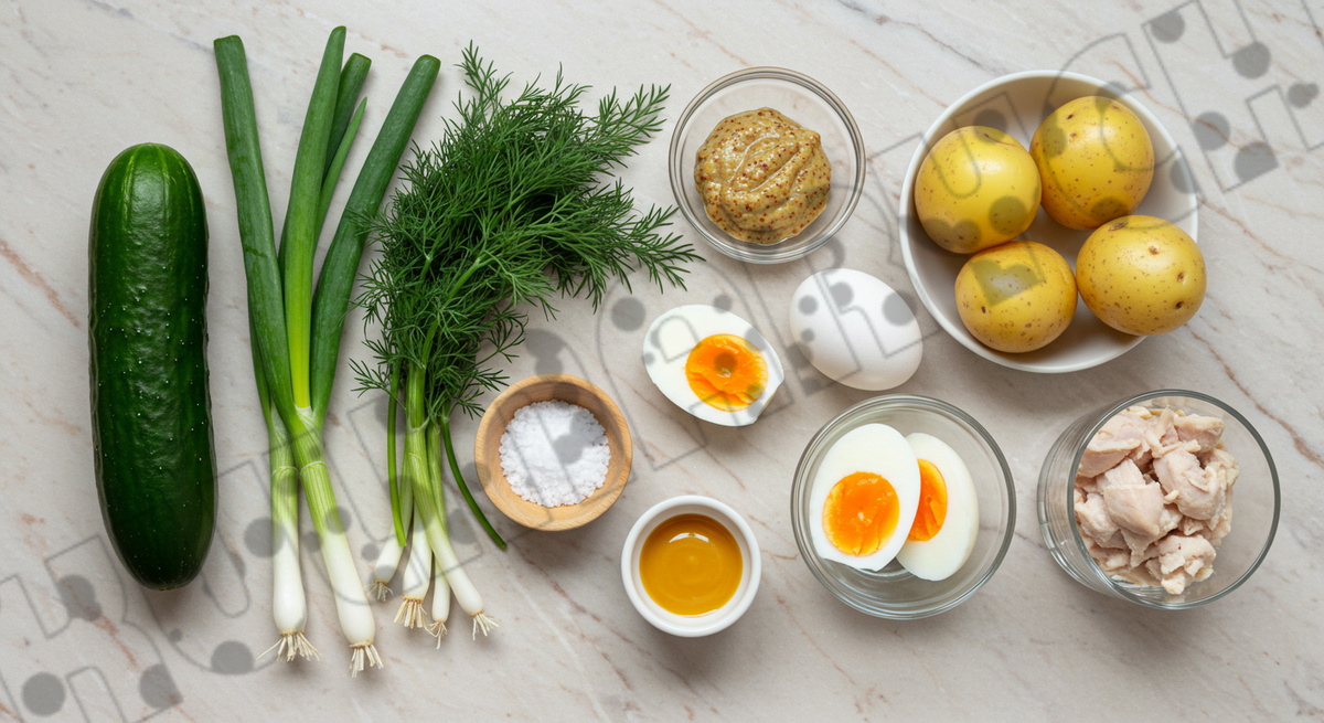 - Огурец: 1 шт. — желательно свежий и хрустящий для яркого контраста.
