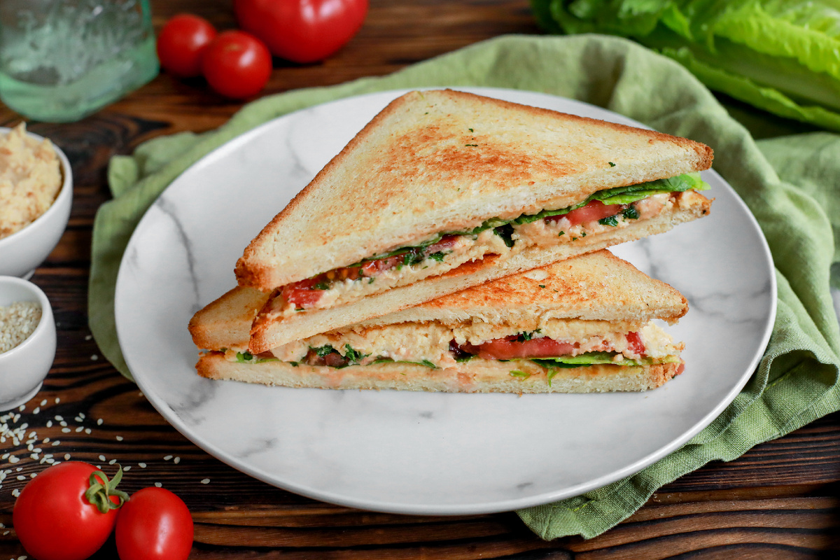 Шаг 3: Нарежьте помидор на кольца, а у листьев салата отломите стебель. На поджаренный хлеб выложите хумус, посыпьте кунжутом, добавьте нарезанные помидоры и листья петрушки. Накройте вторым ломтиком хлеба. Повторите процесс со вторым тостом, затем разрежьте его пополам и подавайте к столу.