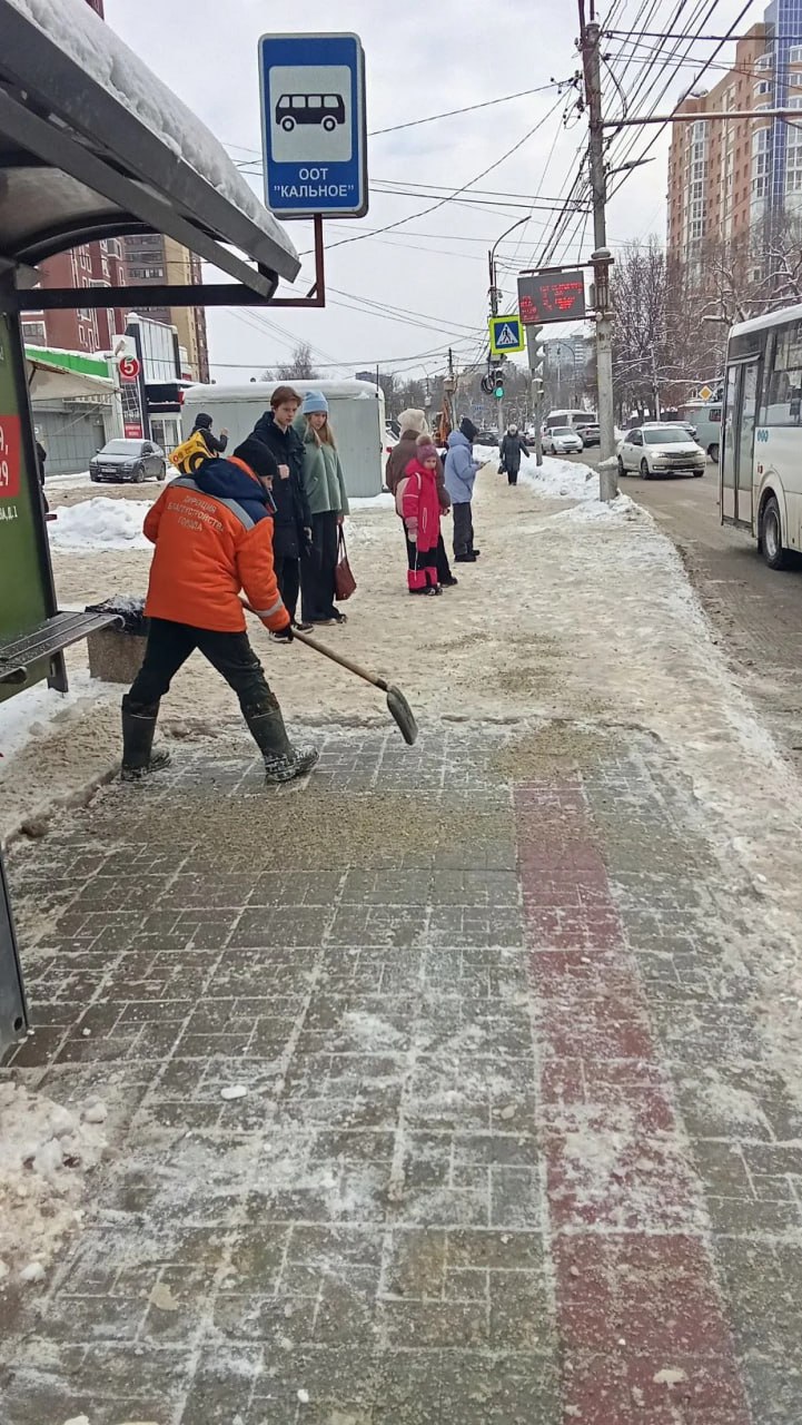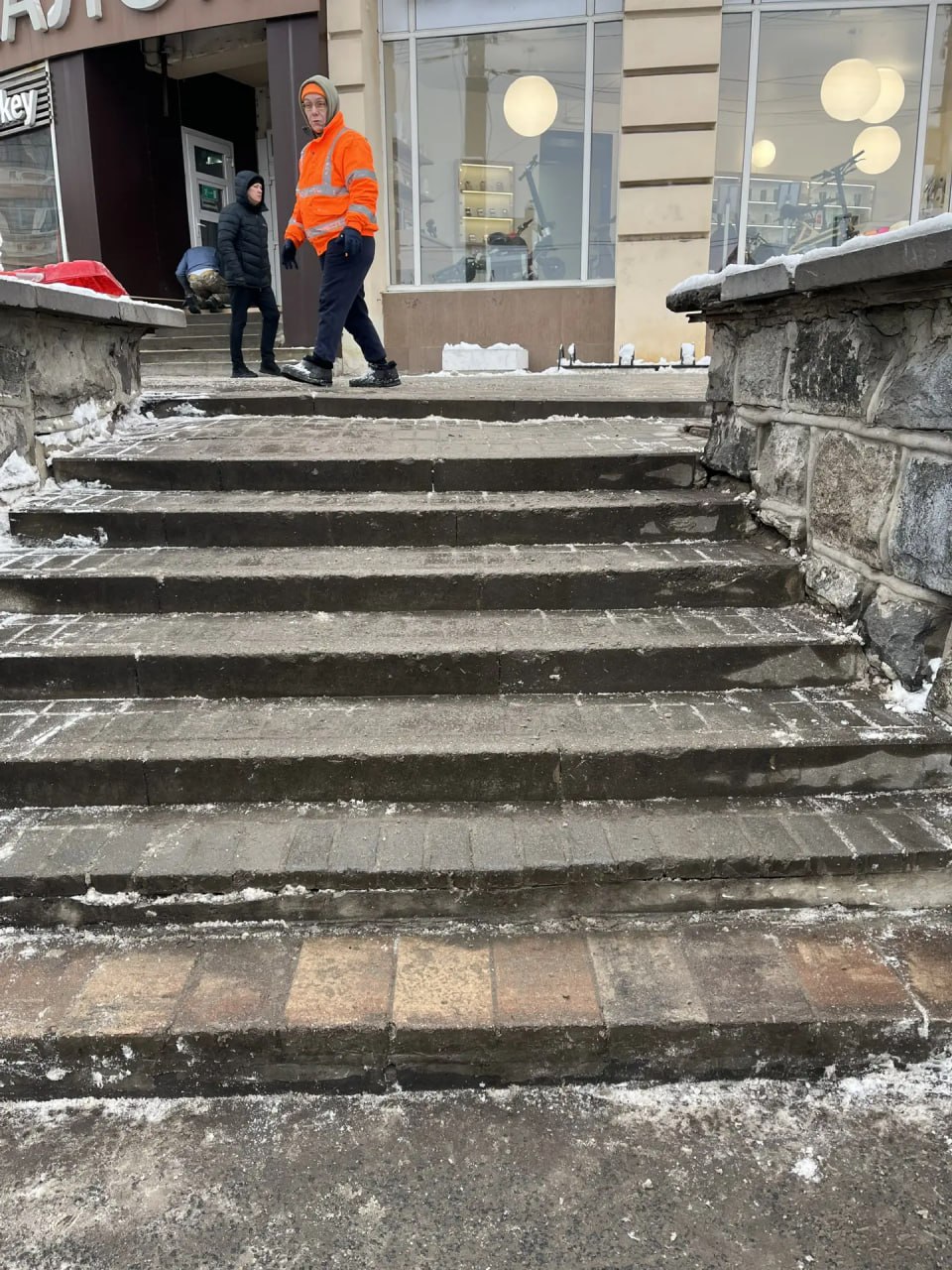 Продолжается расчистка лестниц, на тротуарах во всех районах работают трактора-щетки и «Чистики». Электрики участка наружного освещения устраняют повреждение на улице Мервинской.