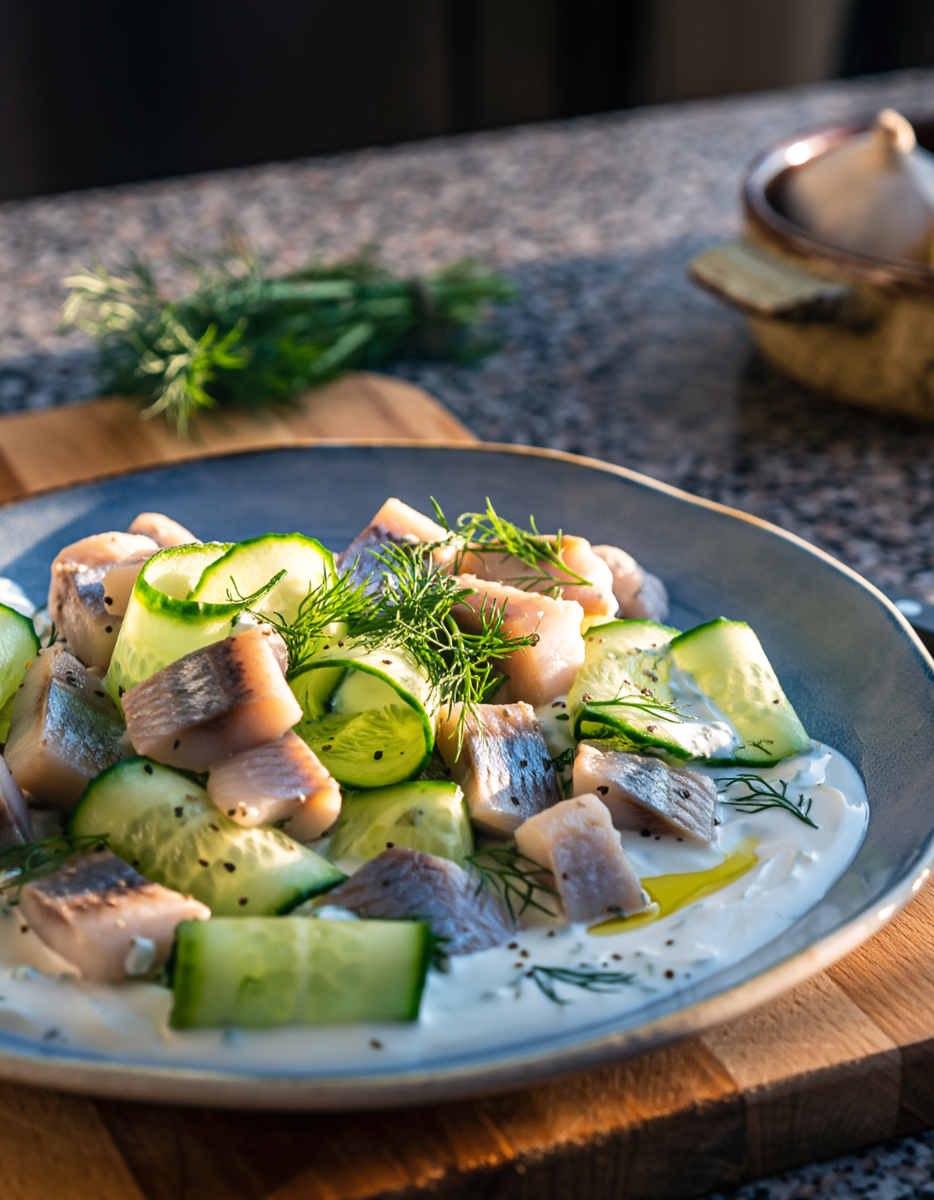 Чтобы сделать селедку менее соленой и более легкой, стоит попробовать подавать ее с огурцом и йогуртовой заправкой: