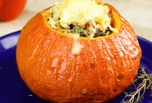 Основа — запеченная тыква: внутри она превращается в натуральную форму посуды, которая пропитывается соком и специями, а в итоге становится сочной и ароматной. Начинку из курицы и грибов укладывают внутрь, добавляют сыр и возвращают в духовку до появления румяной корочки. Такой подход помогает экономить время, так как несколько этапов готовки объединены в одном контейнере.