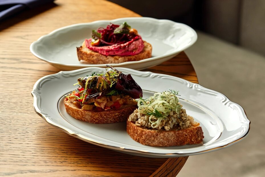 Каждый бутерброд начинается с пюре из нута, затем идёт слой свекольного мусса, завершающий штришок — зелень и орех. Второй — грибная икра с маринованным луком в центре. Третий — баклажанная икра с зеленью. Лёгкий, сдержанный вкус и спокойная подача превращают обычный перекус в маленькое событие момента.