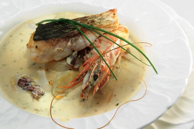 Картофель оставляет часть своей структуры и впитывает бульон, становясь приятной основой для всей массы. В финале в чашу отправляются рыба и морепродукты — они держатся на огне до готовности и подают блюдо с веточками кервеля, что добавляет свежесть.