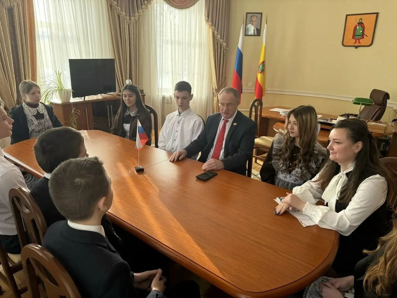 В облдуме с ребятами встретился заместитель Председателя Рязанской областной Думы Николай Никанорович Макариков, который рассказал им о работе регионального парламента, законодательных инициативах и ответил на интересующие вопросы.
