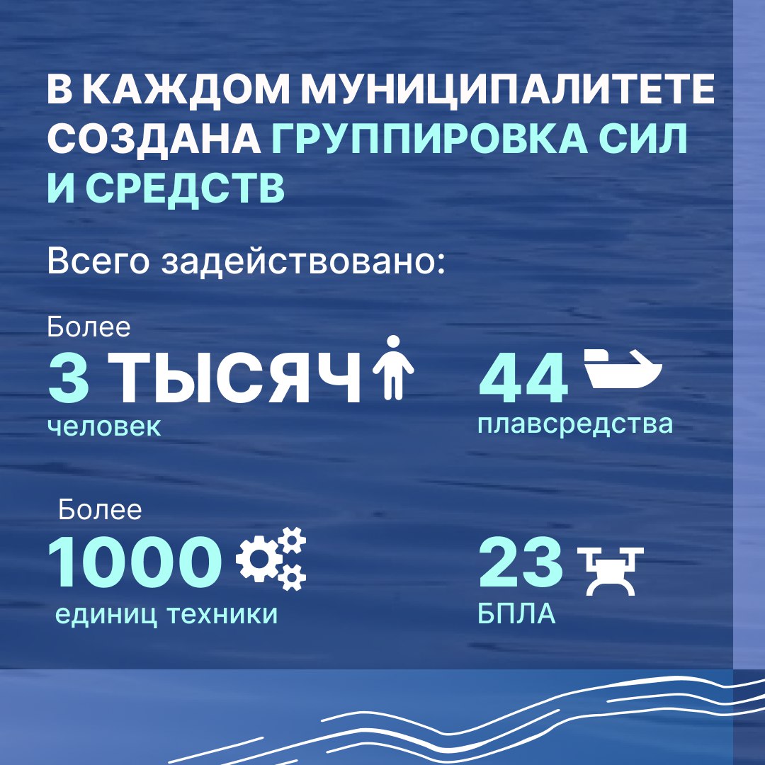 К работе готовы более трёх тысяч человек, свыше тысячи единиц техники, 44 плавательных средства, а также 23 БПЛА. Определены пункты временного размещения населения из возможных зон подтопления — 52 объекта, в них могут разместиться более трёх тысяч человек.