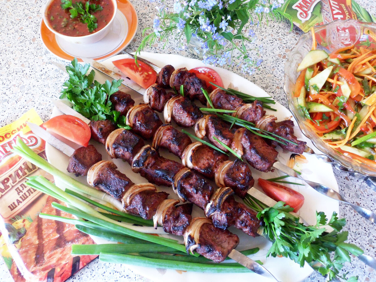 Для шашлыка лучше всего подойдёт охлажденное филе (вырезка), которое рекомендуется замариновать накануне вечером. Кусочки мяса следует нарезать среднего размера: слишком крупные куски могут не прожариться, а мелкие — пересохнуть. Также подготовьте бутылку с водой для тушения пламени и махалку для регулировки жара у мангала.