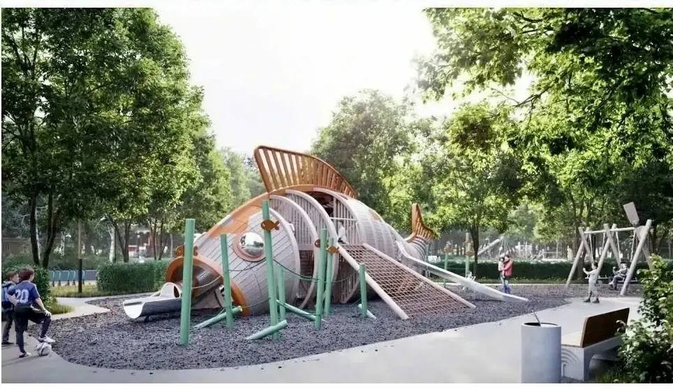 На территории площадью 1800 квадратных метров формируется большое игровое пространство, уникальное по своей форме и наполнению. Разноуровневая площадка подразумевает множество сценариев игры для всех возрастов: игра с водой и песком, горки, сюжетные игровые элементы, большие качели с различными типами сидений. Всё детское игровое оборудование будет выполнено из природных и экологичных материалов, а также выдержано в единой концепции животного мира.