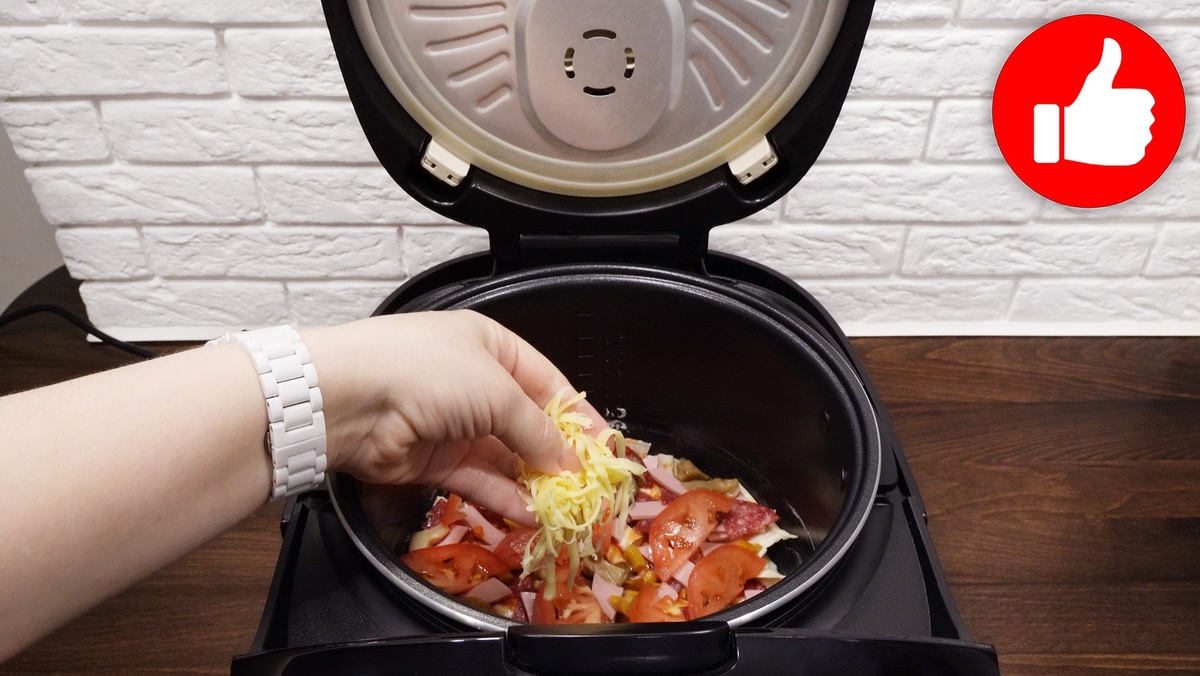 Следующий шаг – добавить соус. С помощью кисточки или ложки равномерно распределите кетчуп по поверхности. Затем выложите начинку: нарезанную колбасу, грибы, мелко порезанные помидоры и тертый сыр. Все это необходимо готовить в режиме «Выпечка» или «Мультиповар» при температуре 130°C в течение 15 минут.
