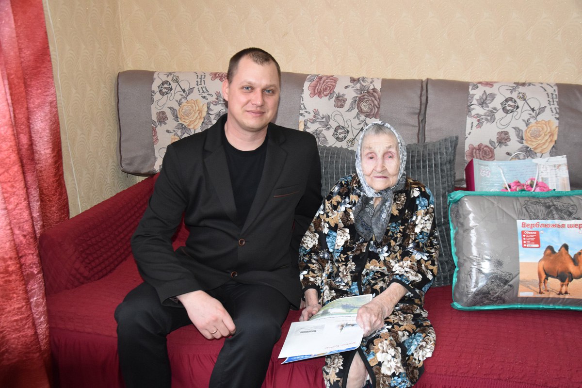 Со 100-летием Александру Крючкову пришли поздравить заместитель главы администрации округа по социальным вопросам Артур Мосейчук и главный специалист по социальной работе Любовь Моксякова.