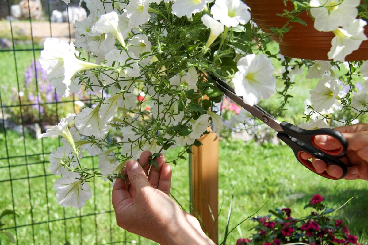 Кустовые и прямостоячие петунии обрезают по кругу, оставляя 10-15 см от корня. Важно не стричь растение слишком низко. Ампельные сорта требуют более деликатного подхода: достаточно подрезать несколько верхних плетей. Это поможет избежать оголения верхушки, а обрезанные части быстро обрастут новыми побегами.