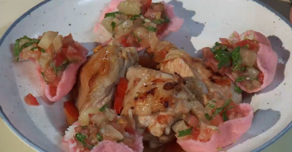 Нарезать болгарский перец средними кусочками, лук — тонкими полукольцами, чеснок и перец чили мелко нарубить. Имбирь очистить и мелко порезать. Помидор нарезать кубиками, срезав стенку.На растительном масле обжарить имбирь и чеснок до золотистости. Затем добавить нарезанные лук, помидор и болгарский перец, обжаривать до мягкости.Курицу нарезать на куски, добавить к овощам и обжаривать все вместе. Посолить, добавить щепотку сахара и полить соком лайма для аромата.Выложить смесь в керамическую форму, сбрызнуть растительным маслом и запекать в духовке при температуре 180-190 градусов около 20-25 минут.Рис промыть, залить водой и отварить до готовности.Консервированный ананас, помидор, кинзу и чеснок нарезать, добавить сок лайма, сахар и масло — это будет сальса.Разогреть масло для фритюра и обжарить креветочные чипсы. Выложить их на бумажное полотенце, чтобы устранить лишнее масло.В каждый чипс положить немного отварного риса, посыпать тертой цедрой лайма и сверху добавить сальсу.Подавайте курицу с овощами в глубокой тарелке, рядом положите чипсы. Приятного аппетита!