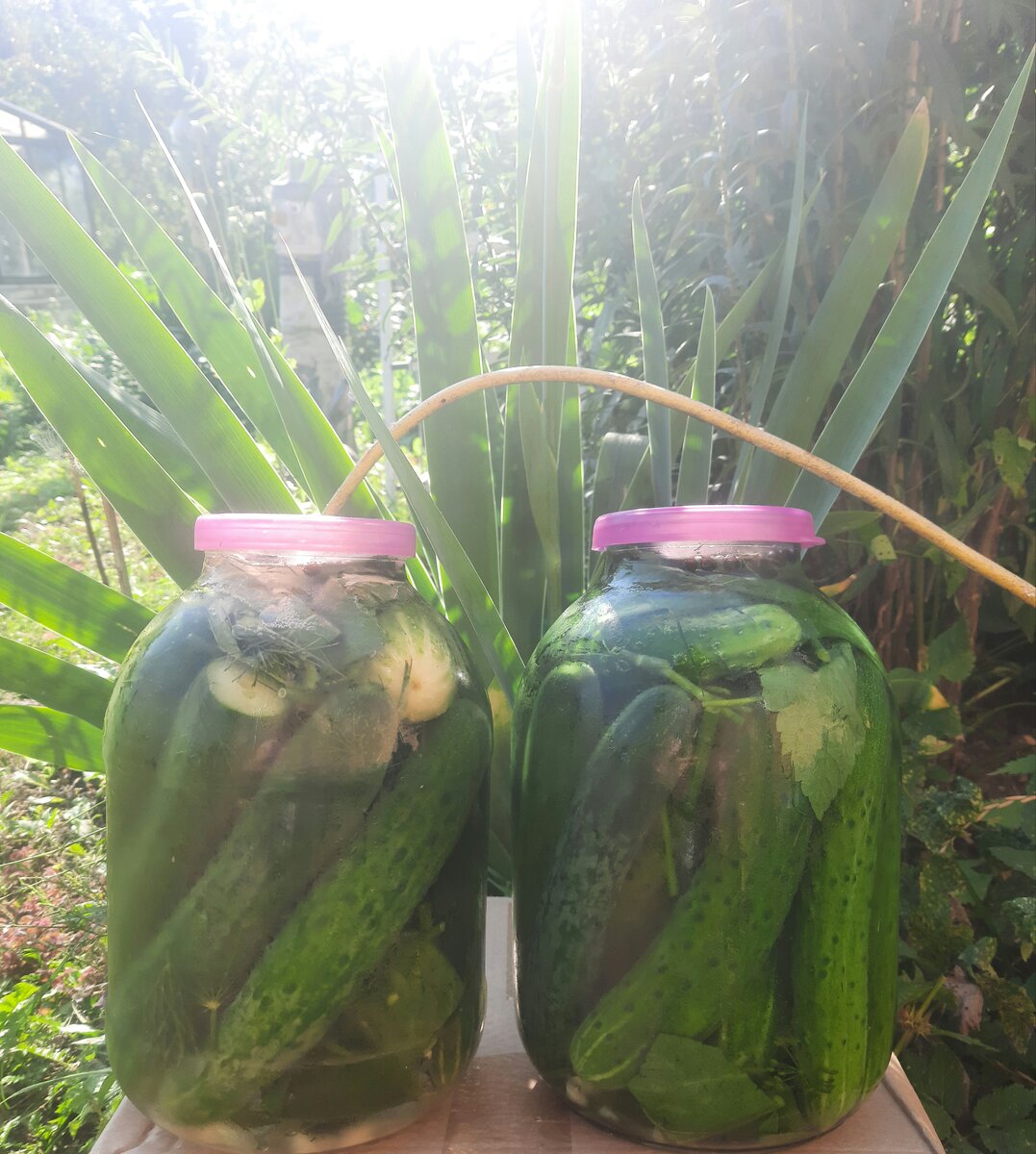 Затем банки заполняются плотно промытыми огурцами, после чего сверху добавляются остатки зелени. В холодной воде растворите соль с расчётом одна ложка на литр. Если соль каменная, тщательно перемешайте и дождитесь, пока осадок осядет на дно. Залейте огурцы солёной водой до самого верха и закройте банки полиэтиленовыми крышками, которые можно ненадолго ошпарить кипятком. Храните их в прохладном месте — в погребе или холодильнике.