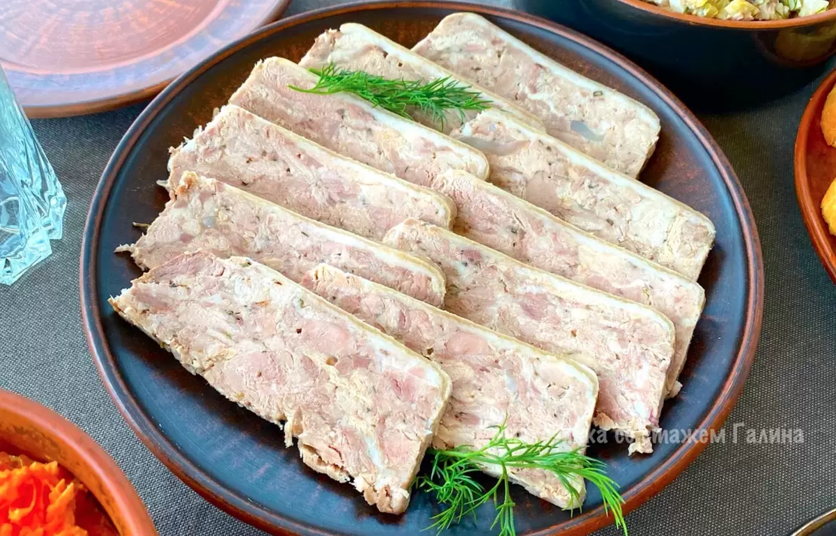После этого прессованная свиная рулька готова к подаче: нарезать ее на тонкие ломтики и предложить с хреном или горчицей для полноты вкуса. Это блюдо не оставит равнодушным ни одного гостя!