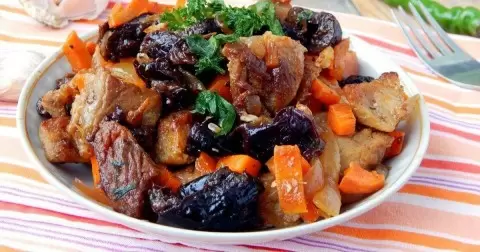 После этого в сковороду возвращается говядина, добавляются чернослив, чеснок и лавровый лист. Влить горячую воду или бульон, чтобы жидкость почти покрывала мясо, уменьшить огонь до минимума и накрыть крышкой. Блюдо должно томиться 1.5-2 часа, чтобы говядина стала мягкой и нежной.