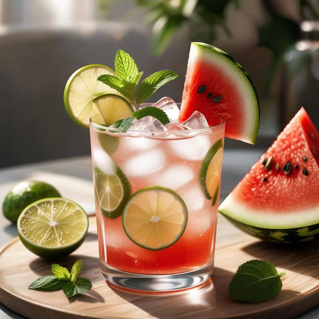- Арбузный лимонад: Простой и вкусный способ утолить жажду — перетолочь кусочки арбуза с лимоном и мятой, добавить газированную воду и лед.