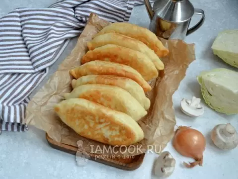 ИНГРЕДИЕНТЫ: Тесто: 100 г муки, 250 мл кипятка, 25 г растительного масла, 1 ч.л. соли, 0,5 ст.л. сахара. Основное тесто: 500 г муки, 190 мл воды, 1 ч.л. быстродействующих дрожжей. Начинка: 300 г свежей капусты, 120 г шампиньонов, 1 луковица. Время приготовления: 60 минут. Калорийность: 187 кКал.