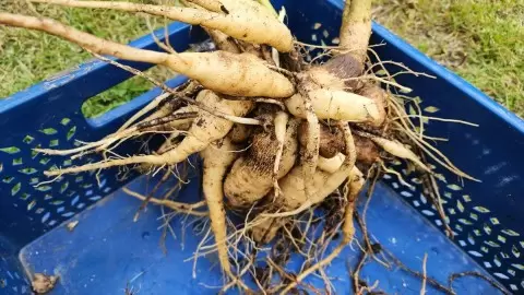 После извлечения клубней их следует тщательно промыть под струёй воды. Это поможет выявить поврежденные участки и гниль. Лишь после этого их делят на части, следя за тем, чтобы каждая деленка имела немного стебля и хотя бы одну почку возобновления.